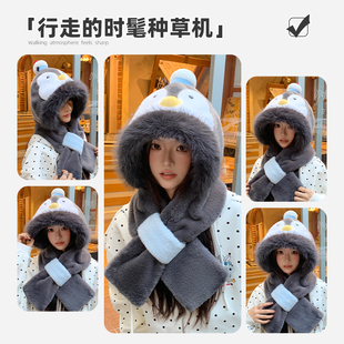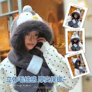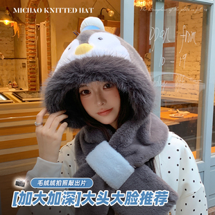 可爱企鹅帽子围巾一体女冬毛绒帽显脸小2025新款 保暖护耳围脖连帽