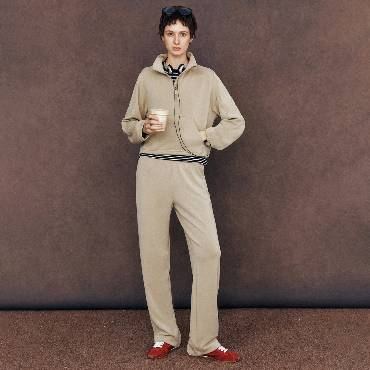 抽绳直筒休闲裤 UNRETRO 绿色运动拉链卫衣女 套装 两件套 首发时尚