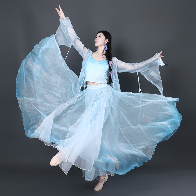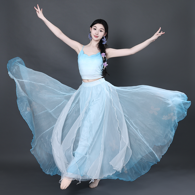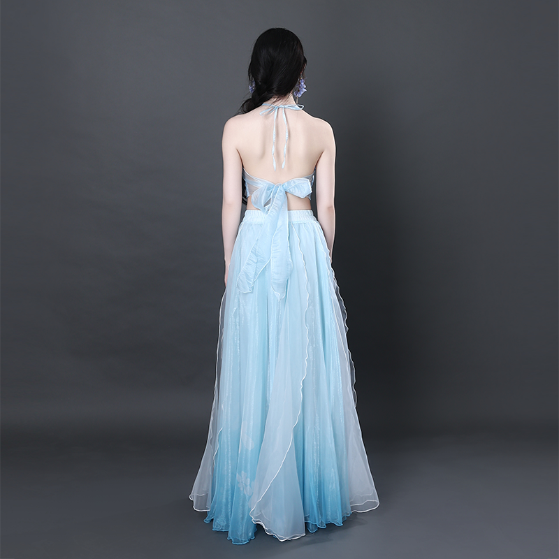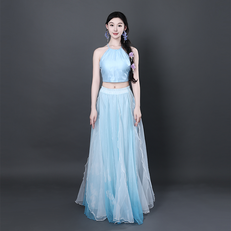 天空蓝渐变仙气纱衣挂脖吊带飘逸大裙摆裙裤 古典现代舞蹈练功服