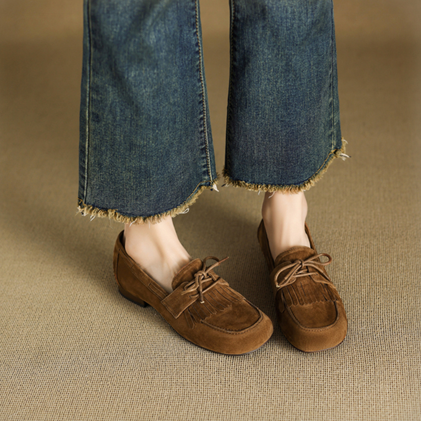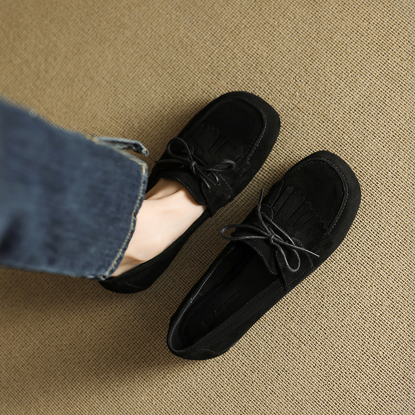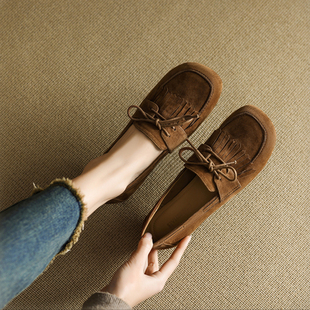 百搭单鞋 流苏蝴蝶结平底豆豆鞋 子 女2025春秋新款 真皮一脚蹬乐福鞋