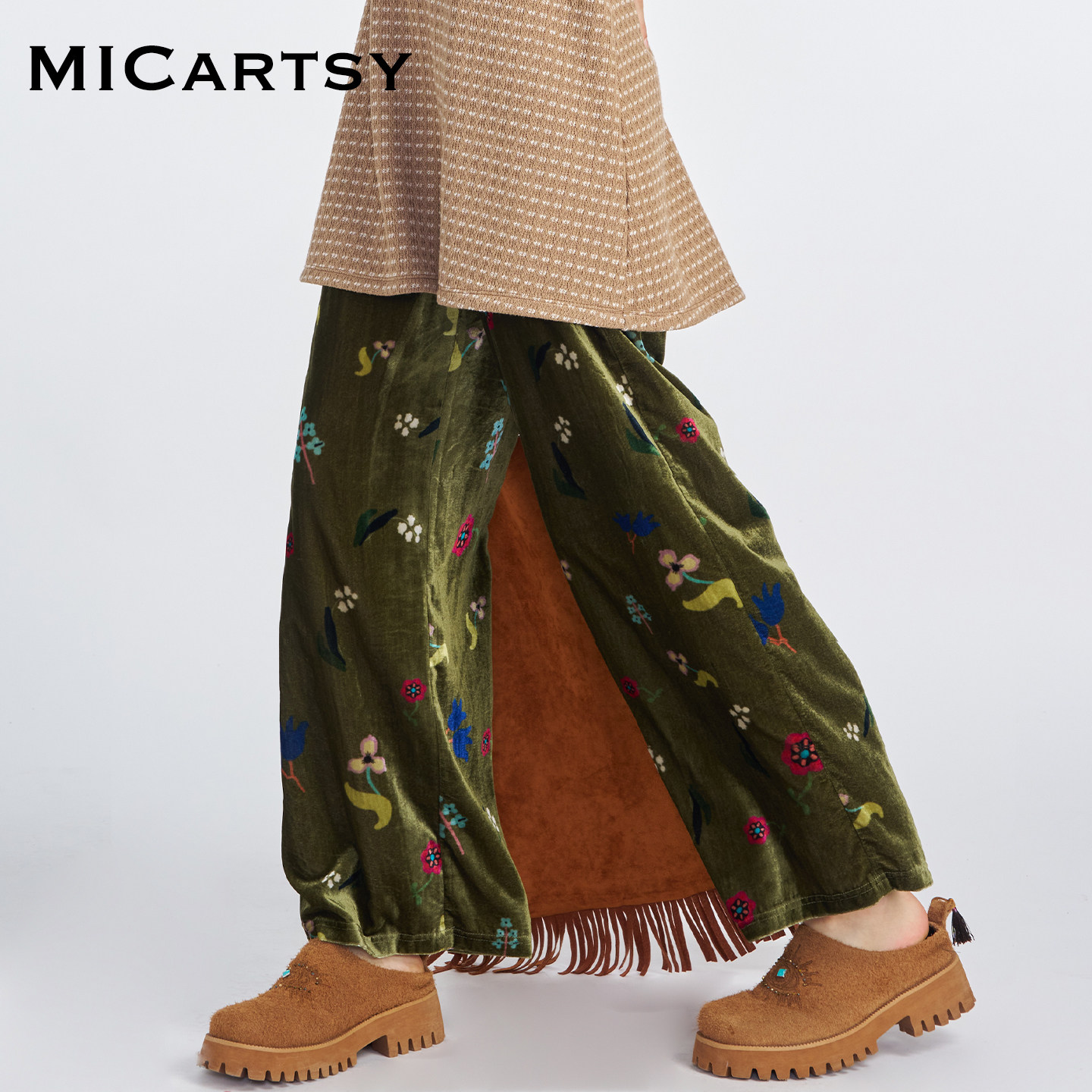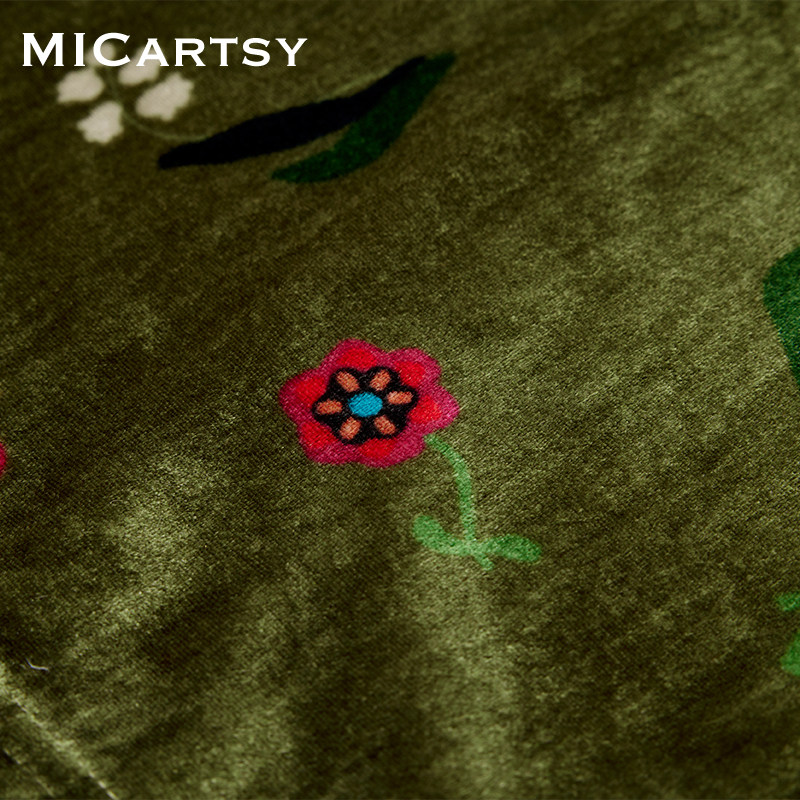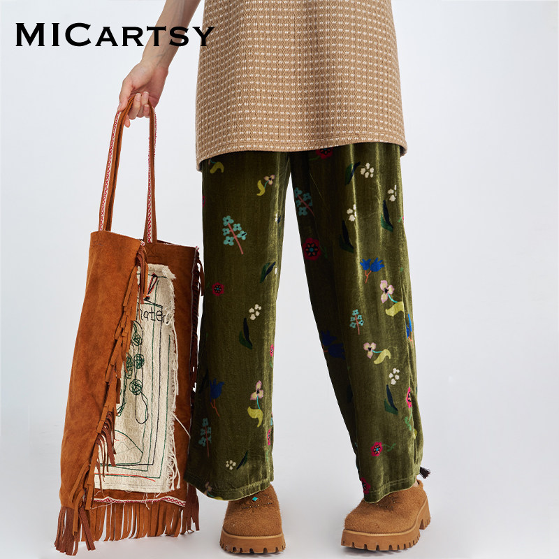 MICartsy王紫珊2025秋冬新款 女 绿色丝绒花朵印花遛弯直筒休闲裤