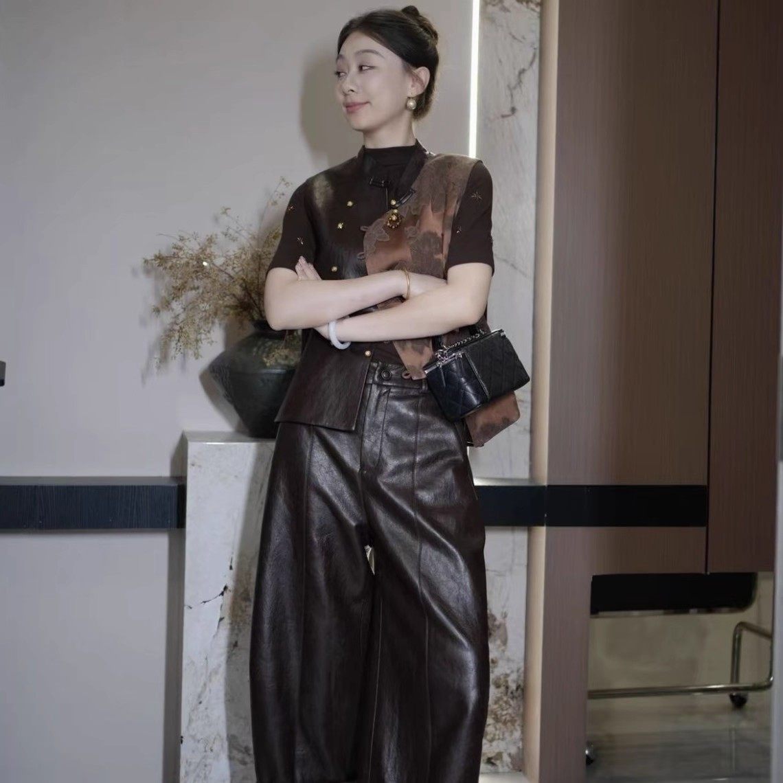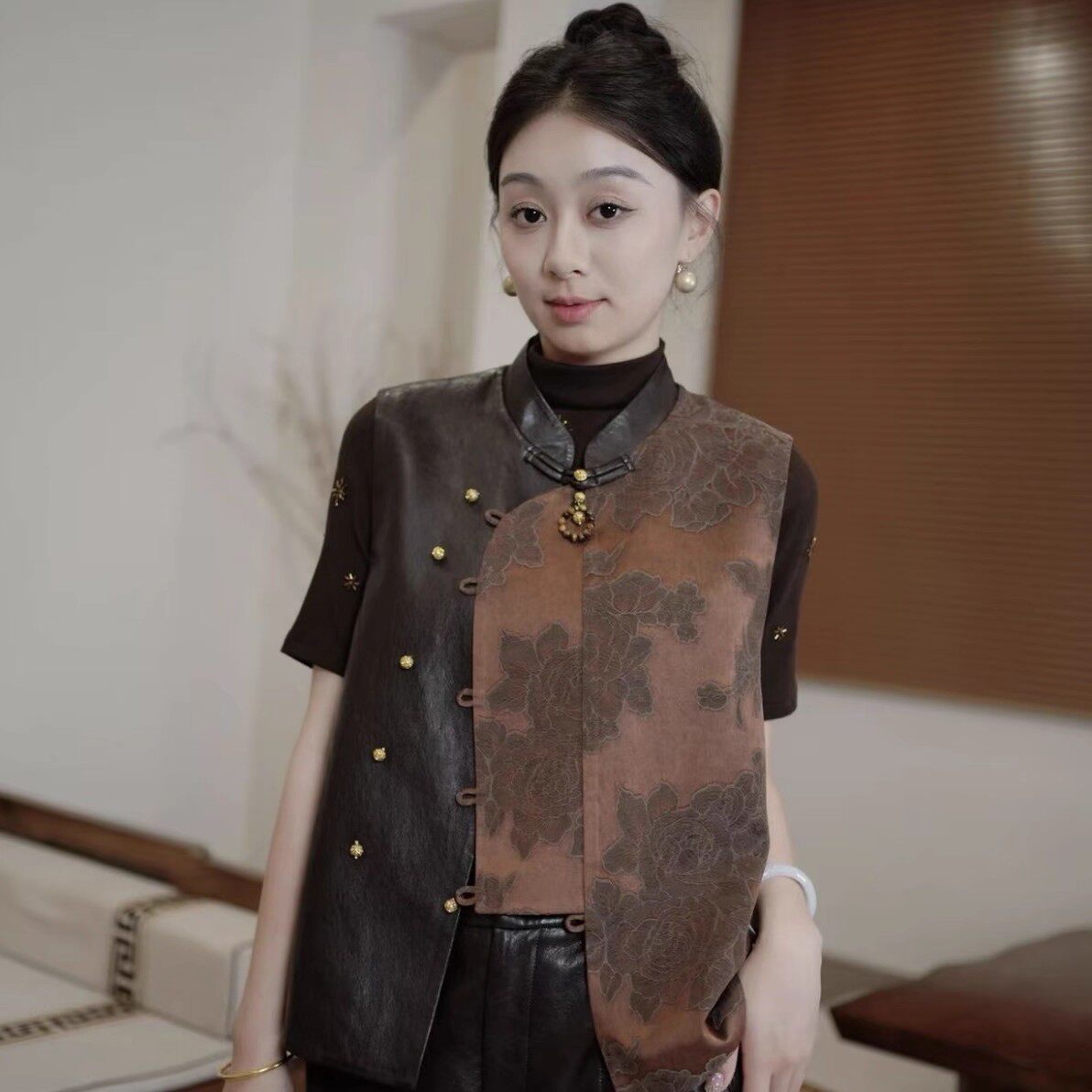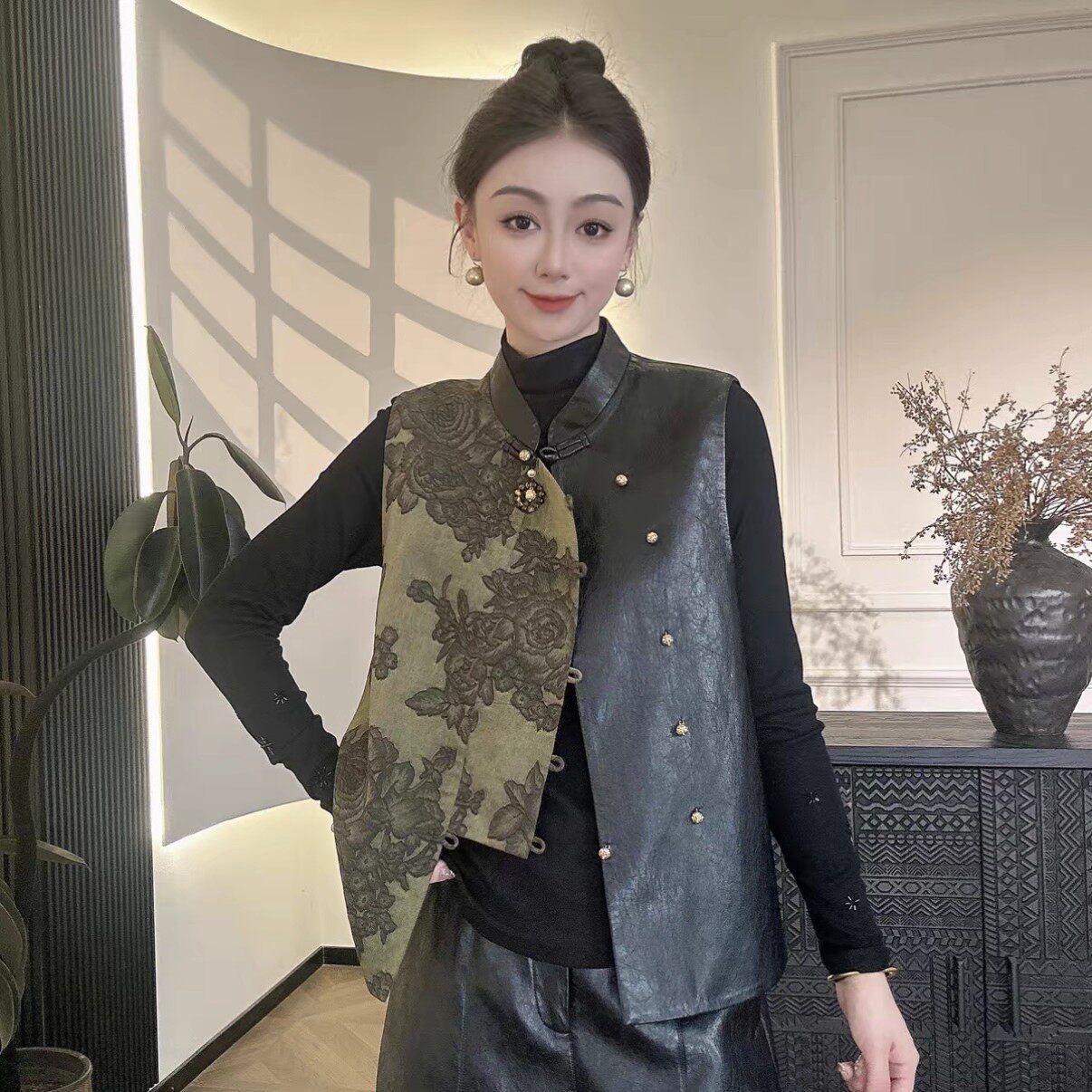 缎面花色国风马甲百搭 新款 新中式 蛋白PU皮拼接马夹背心2025年秋装
