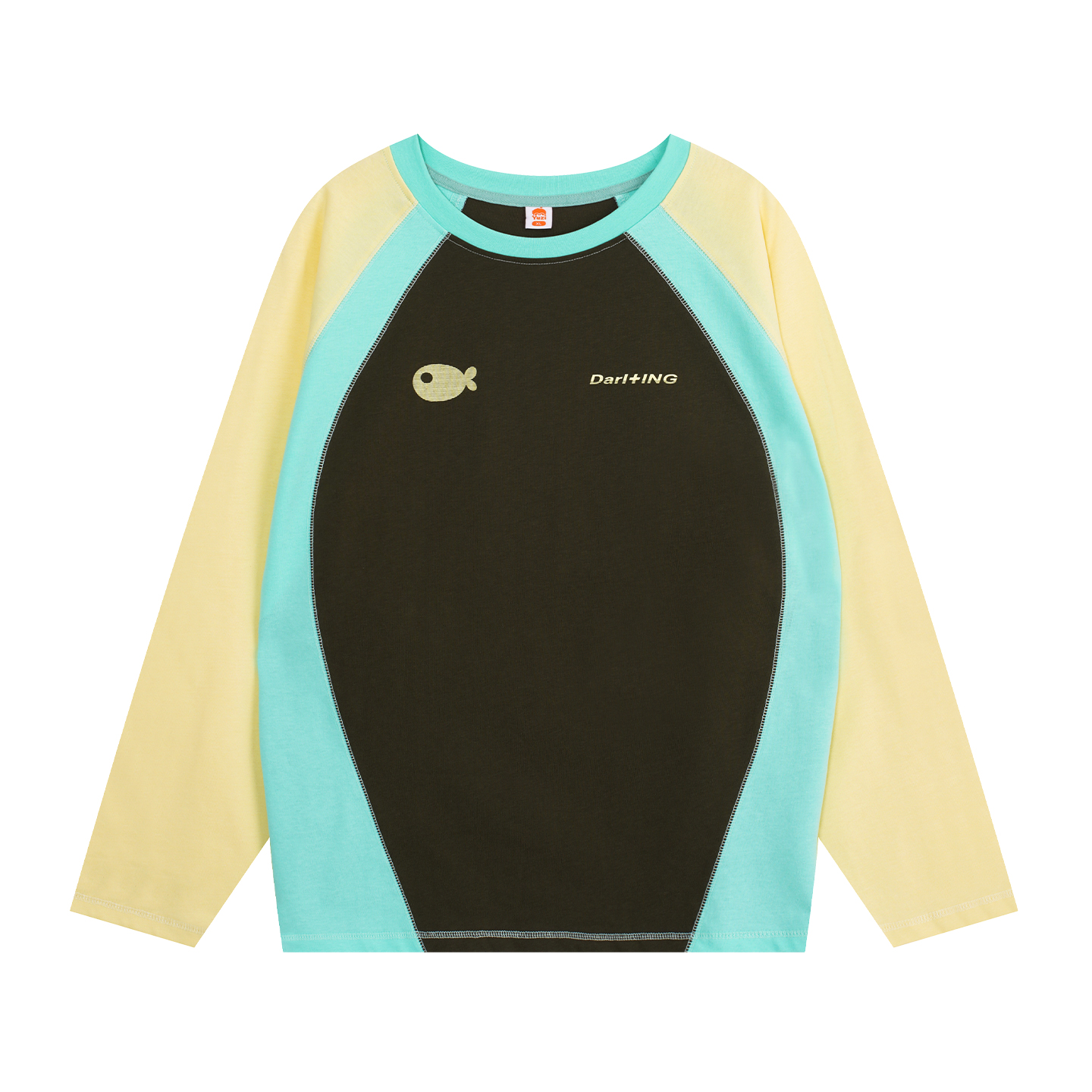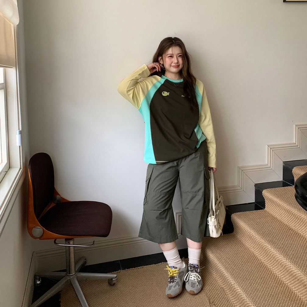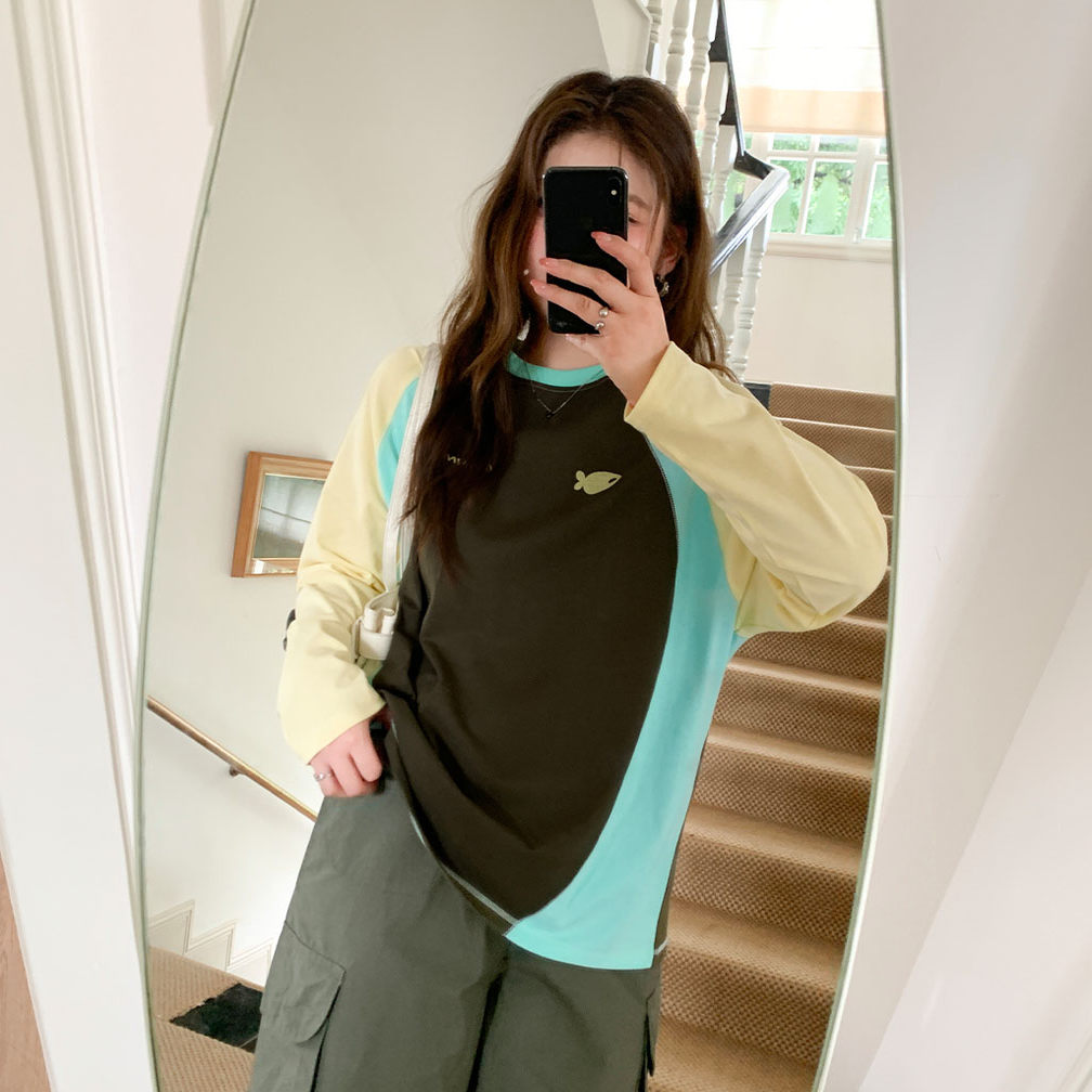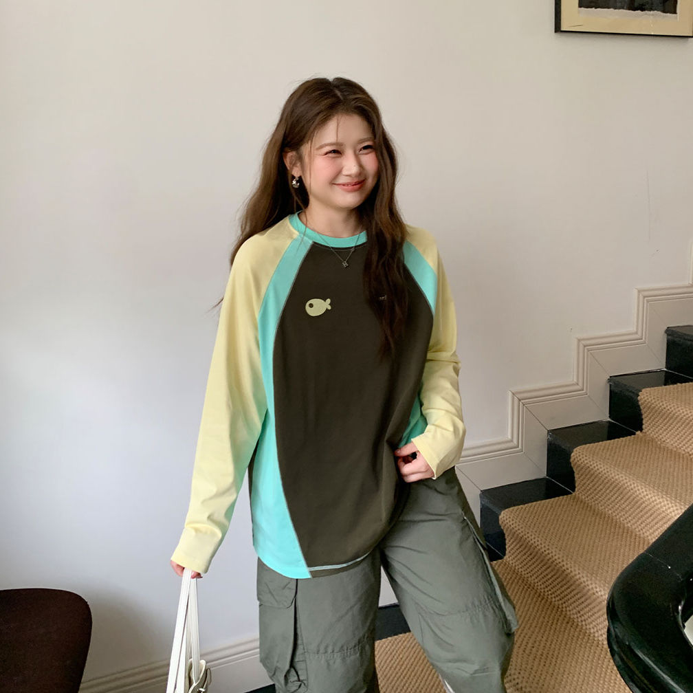 慵懒宽松减龄学院复古胖mm 插肩袖 YUZI鱼子撞色圆领卫衣特大码 女装