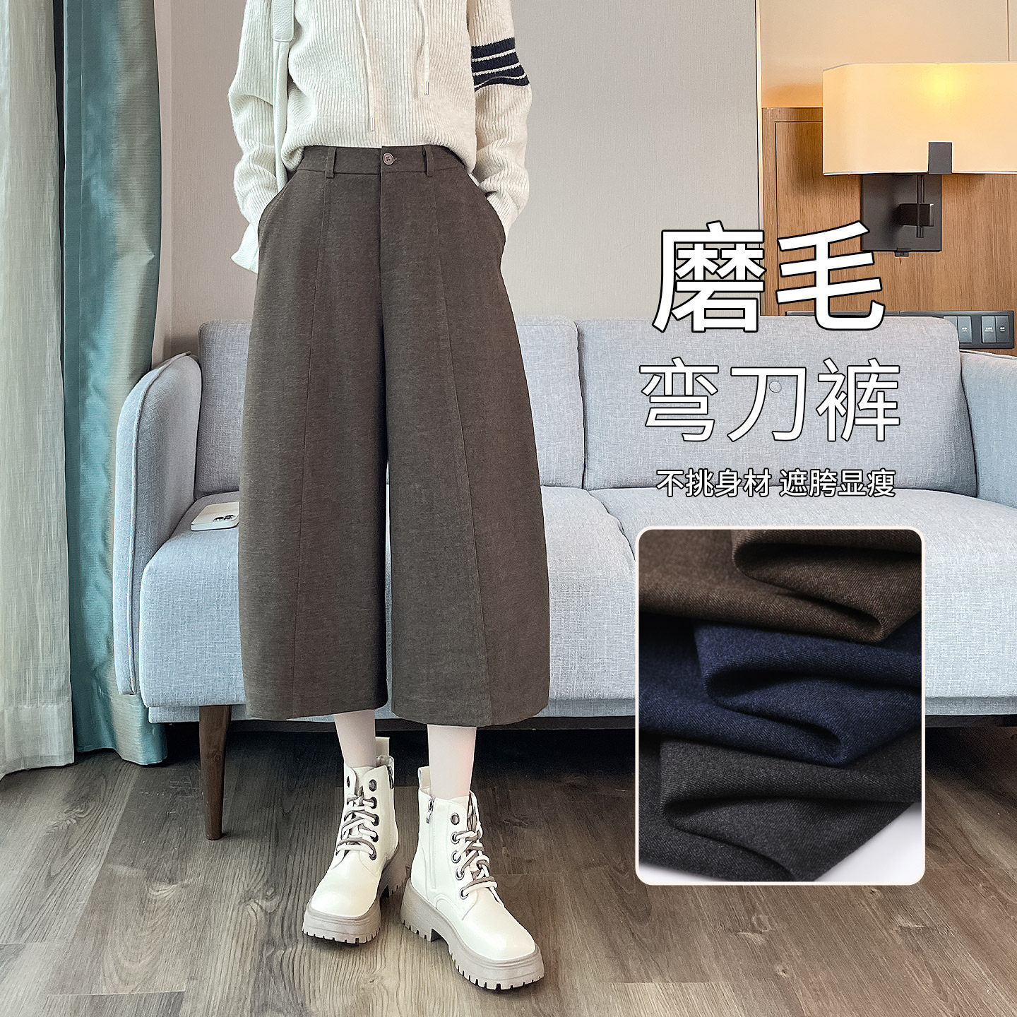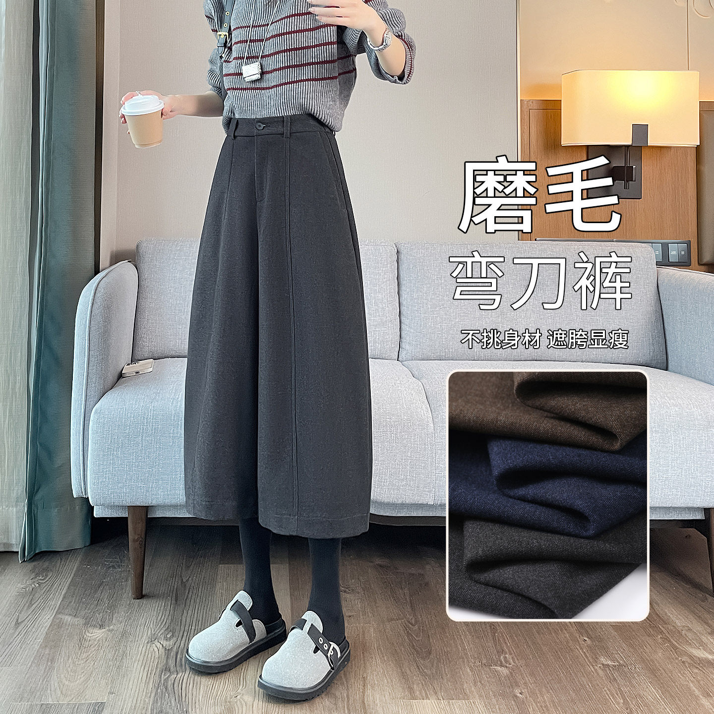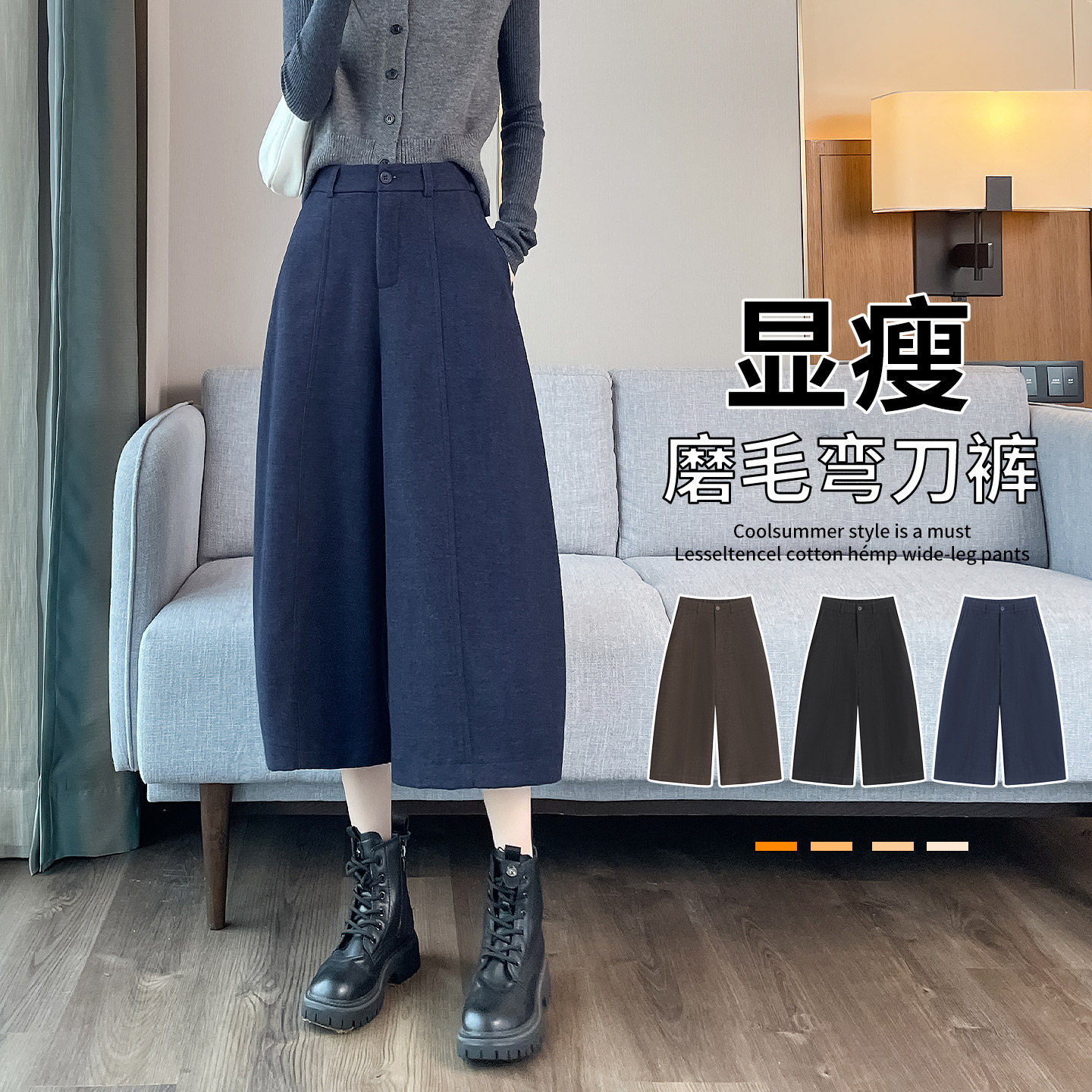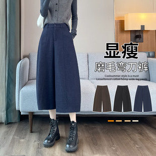 宽松直筒马丁靴裤 藏蓝毛呢弯刀裤 小个子八分裤 女秋冬季 子搭配 靴裤