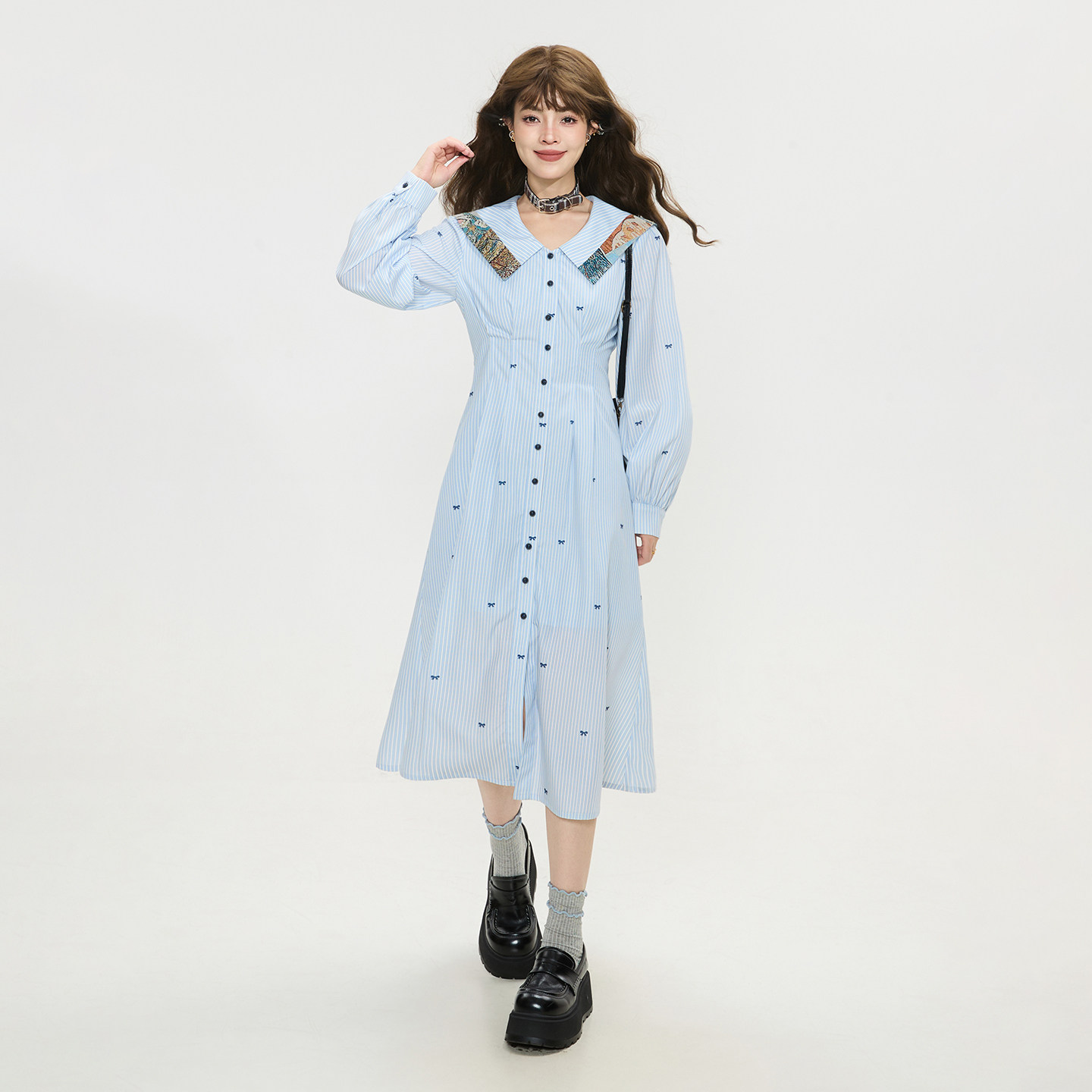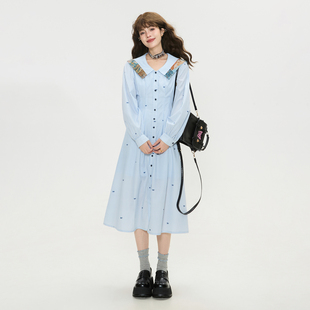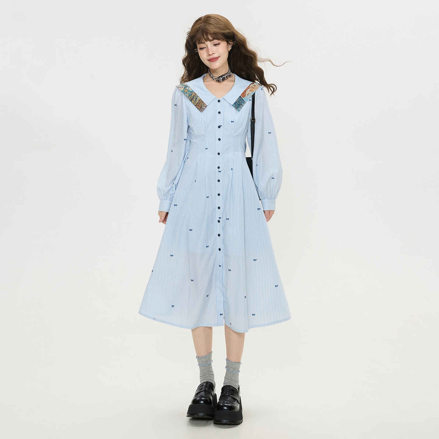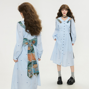 提花拼接收腰显瘦长裙 连衣裙26春季 KEIKO 蝴蝶结飘带蓝色条纹衬衫
