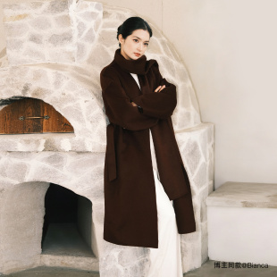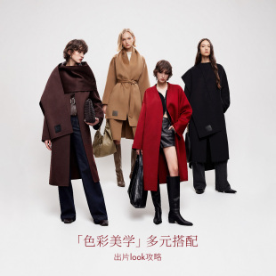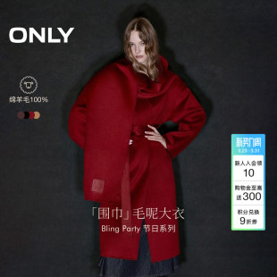 绵羊毛毛呢大衣外套 立裁宽松围巾系带舒适中长款 ONLY2025冬季 新款