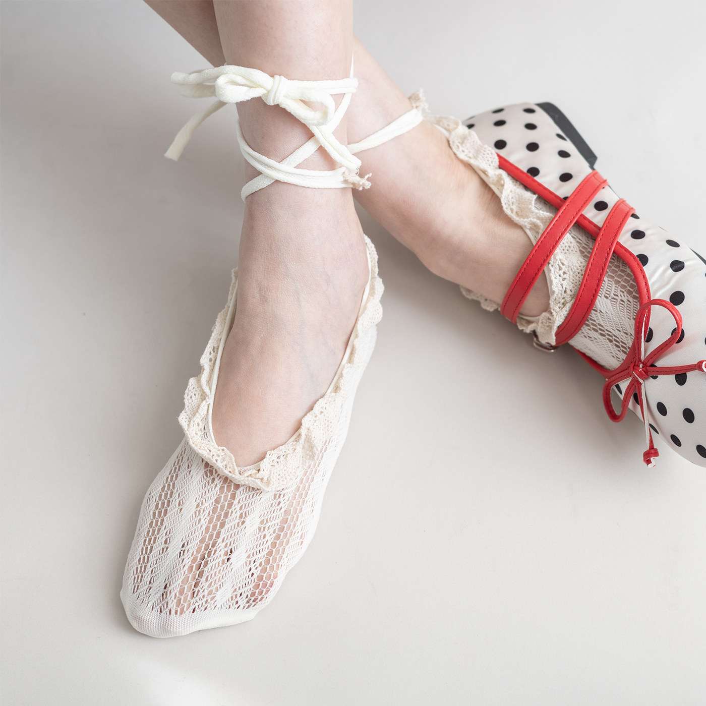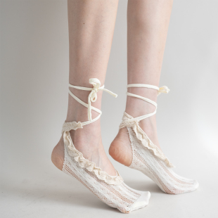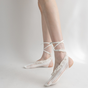 夜间教习室船袜女夏薄款 洛丽塔蕾丝花边绑带漏跟短袜米色浅口袜子