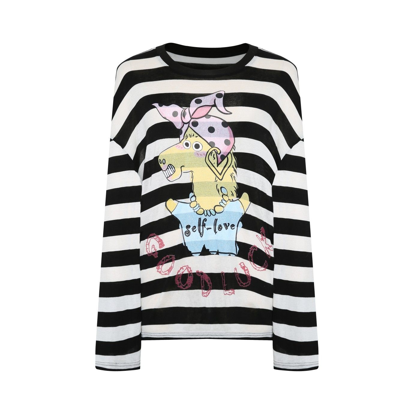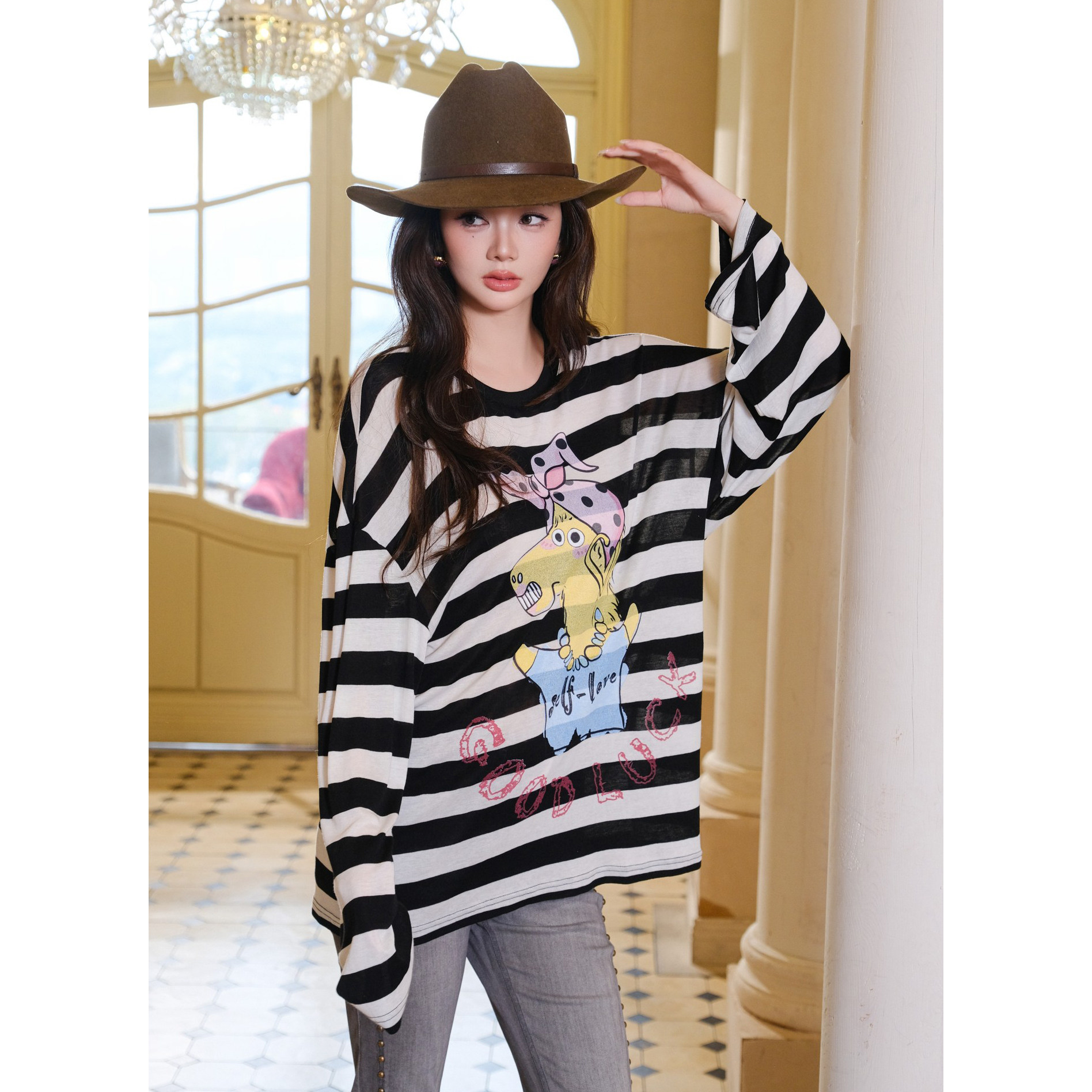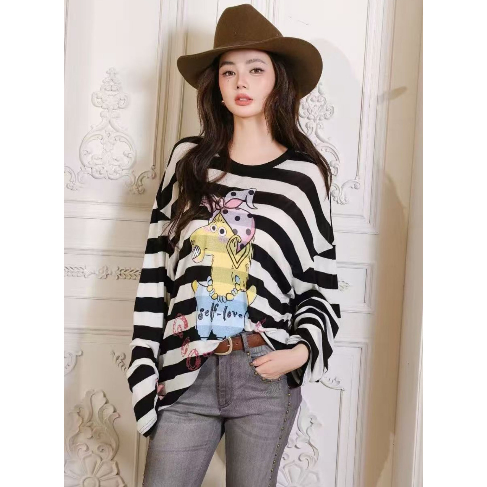 25AW黑白条纹趣味卡通印花上衣灰调铆钉喇叭牛仔裤 Maison Wester