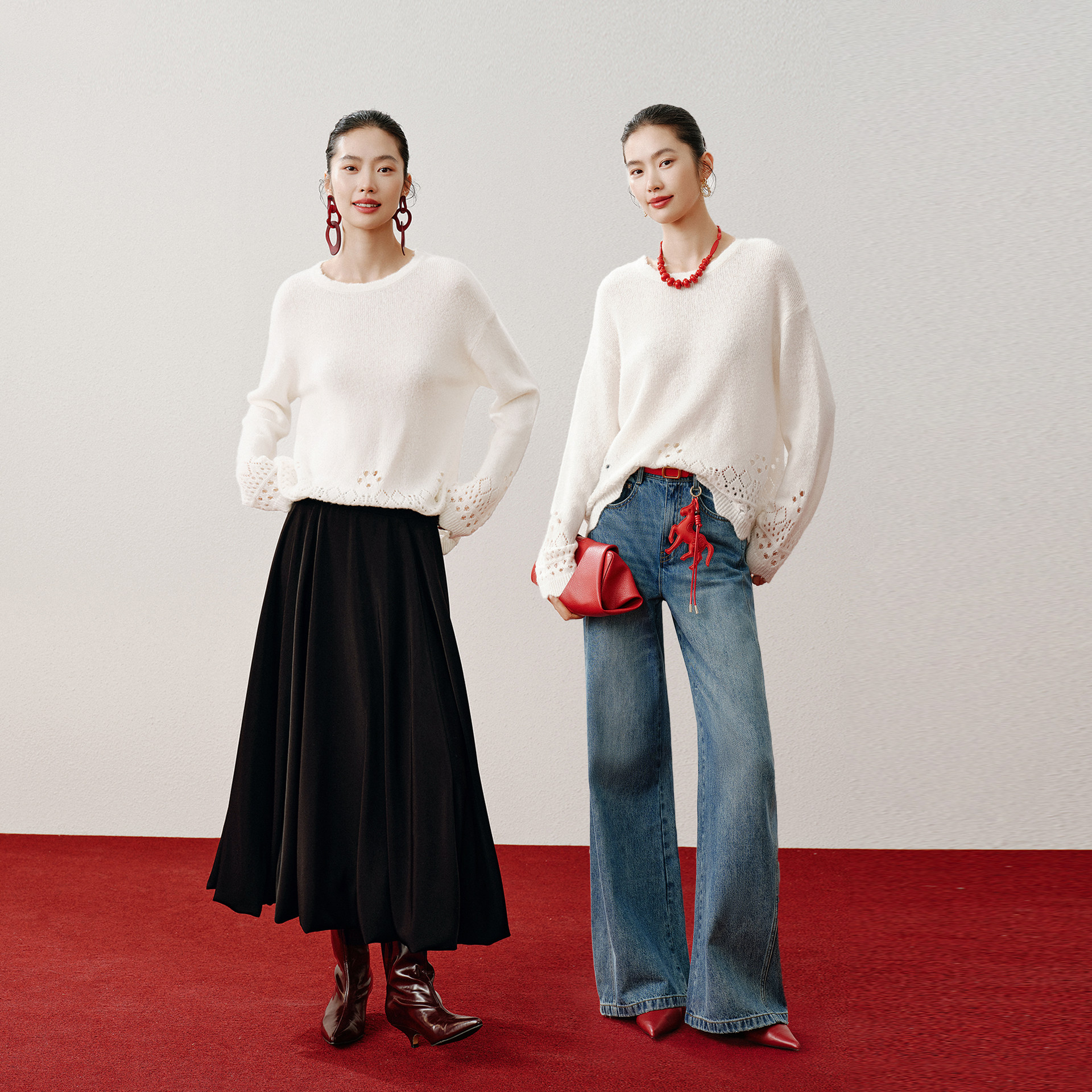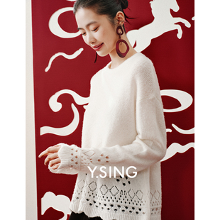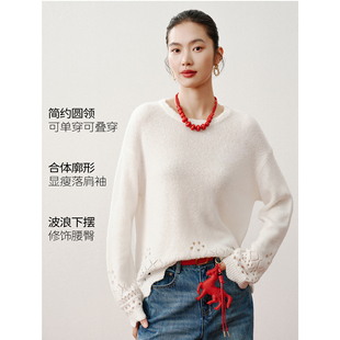 宽松设计感针织衫 新款 上衣 女2026春装 衣香丽影白色镂空钩花羊绒衫