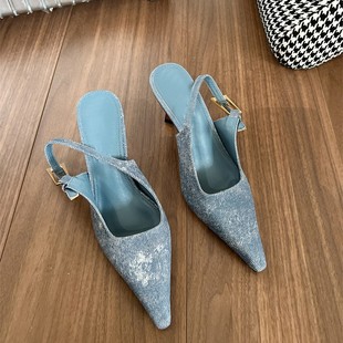包头凉鞋 气质尖头纯色皮带扣浅口细跟一字扣时装 新款 外贸原单女鞋