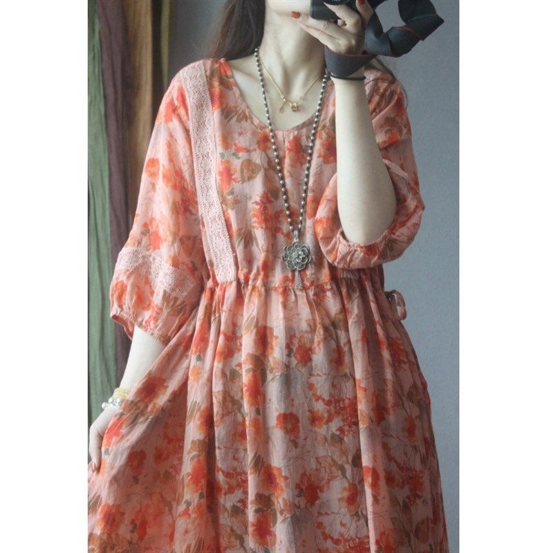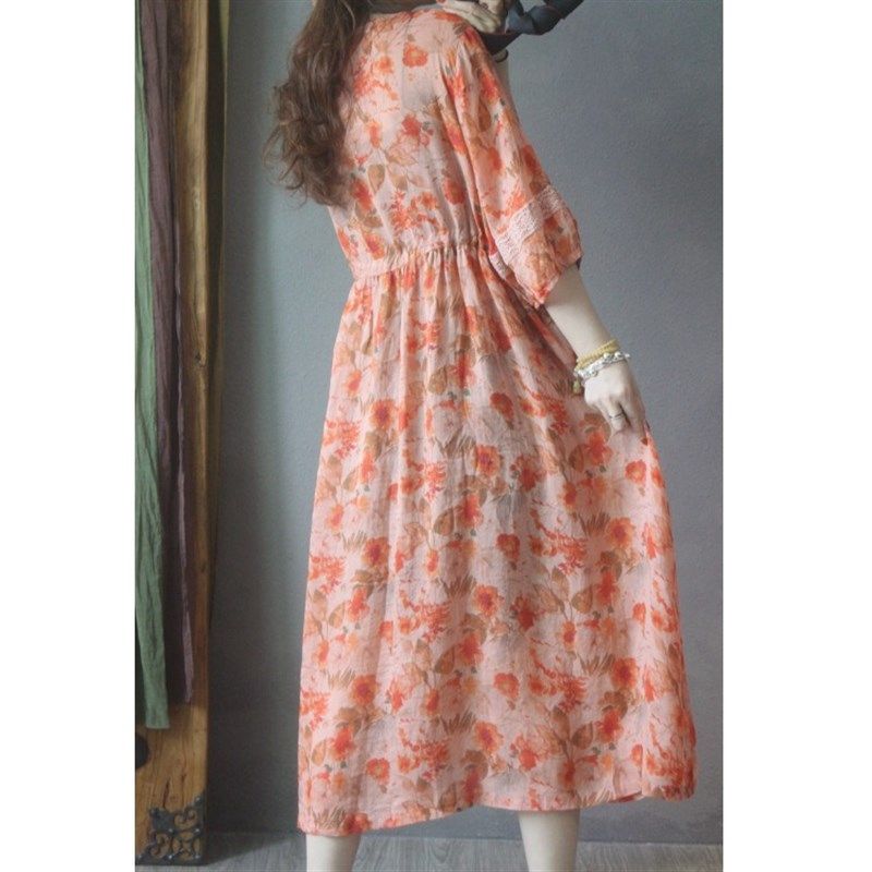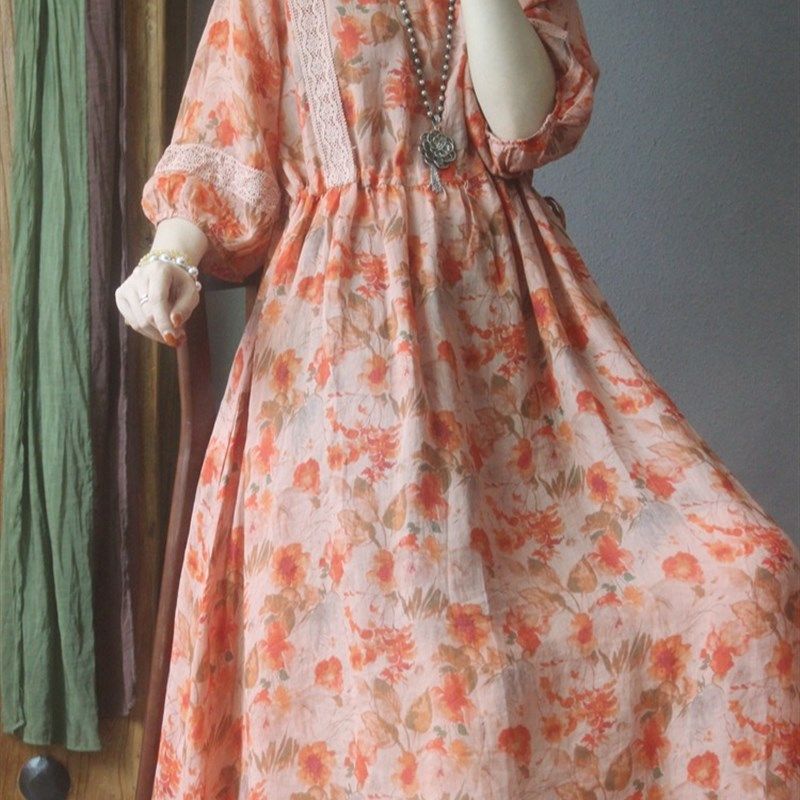 新款 夏季 蕾丝花边洋气收腰裙子 连衣裙女 复古桔色花朵苎麻中长款