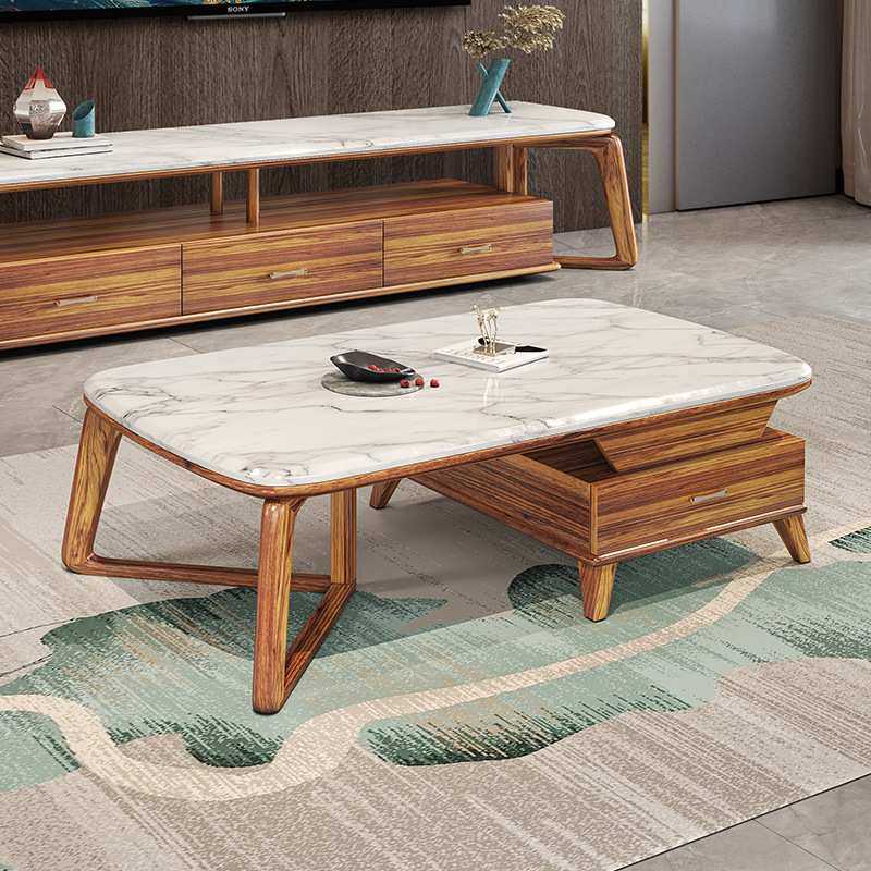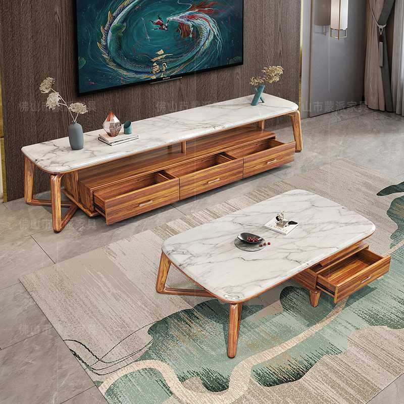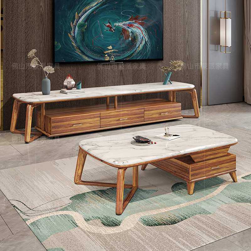 现代新中式 实木茶几电视柜组合简约乌金木大理石台面茶几2025新款