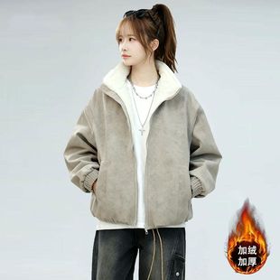 黑色休闲百搭连帽夹克上衣 胖mm双面穿毛绒棉服外套女冬季 大码 女装