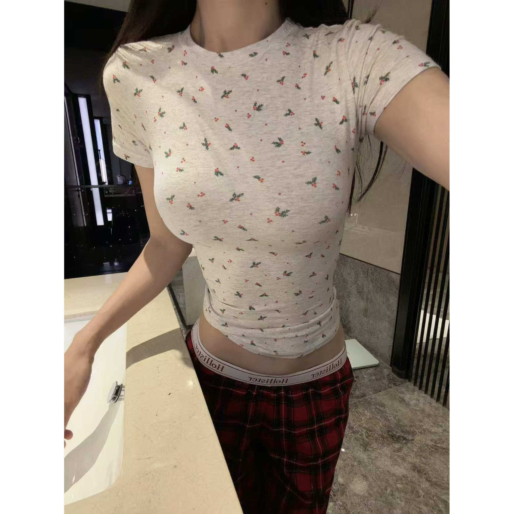 短袖 新款 夏季 李琴琴限定印花棉质圆领掐腰显瘦正肩T恤内搭打底衫