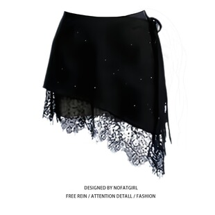 大码 假两件设计感半身裙子 胖MM黑色蕾丝拼接系带不规则短裙女春季