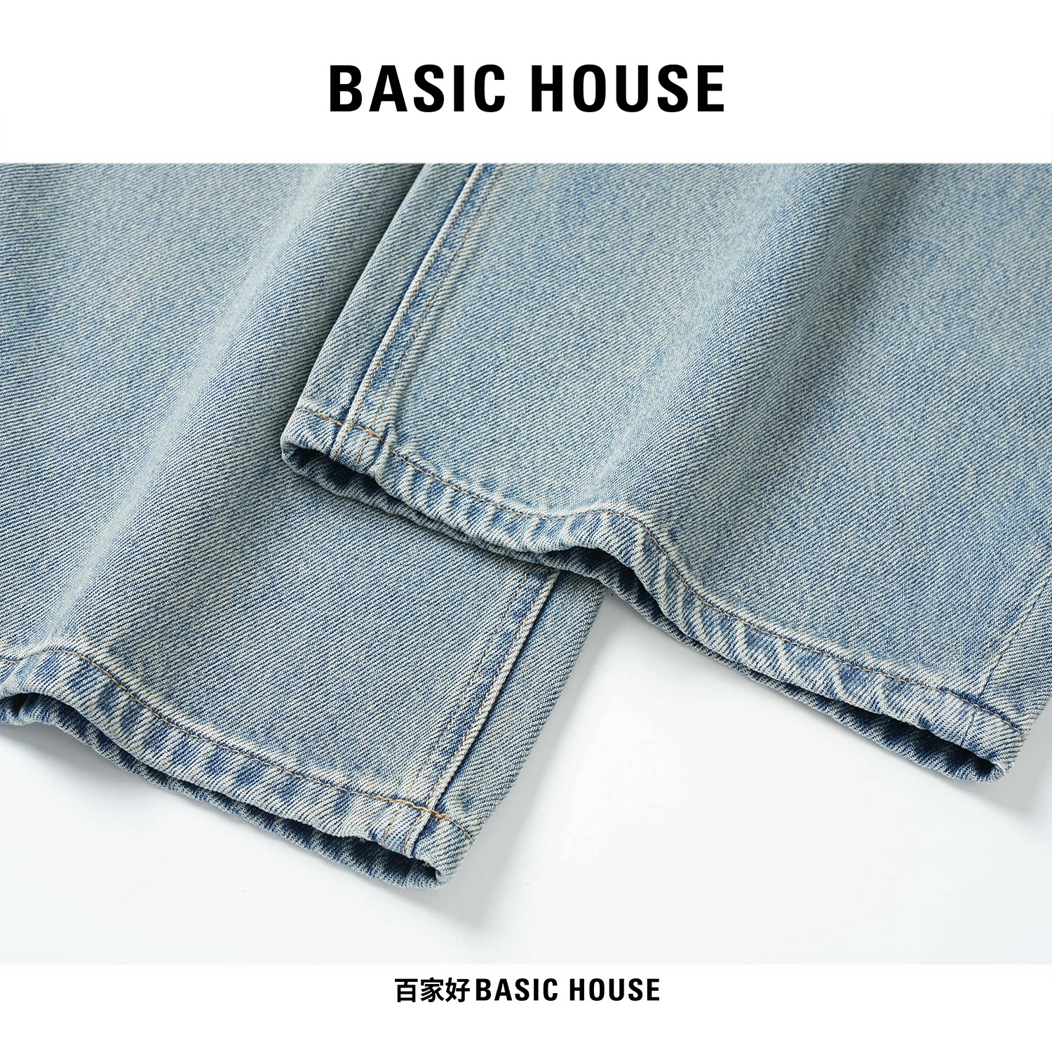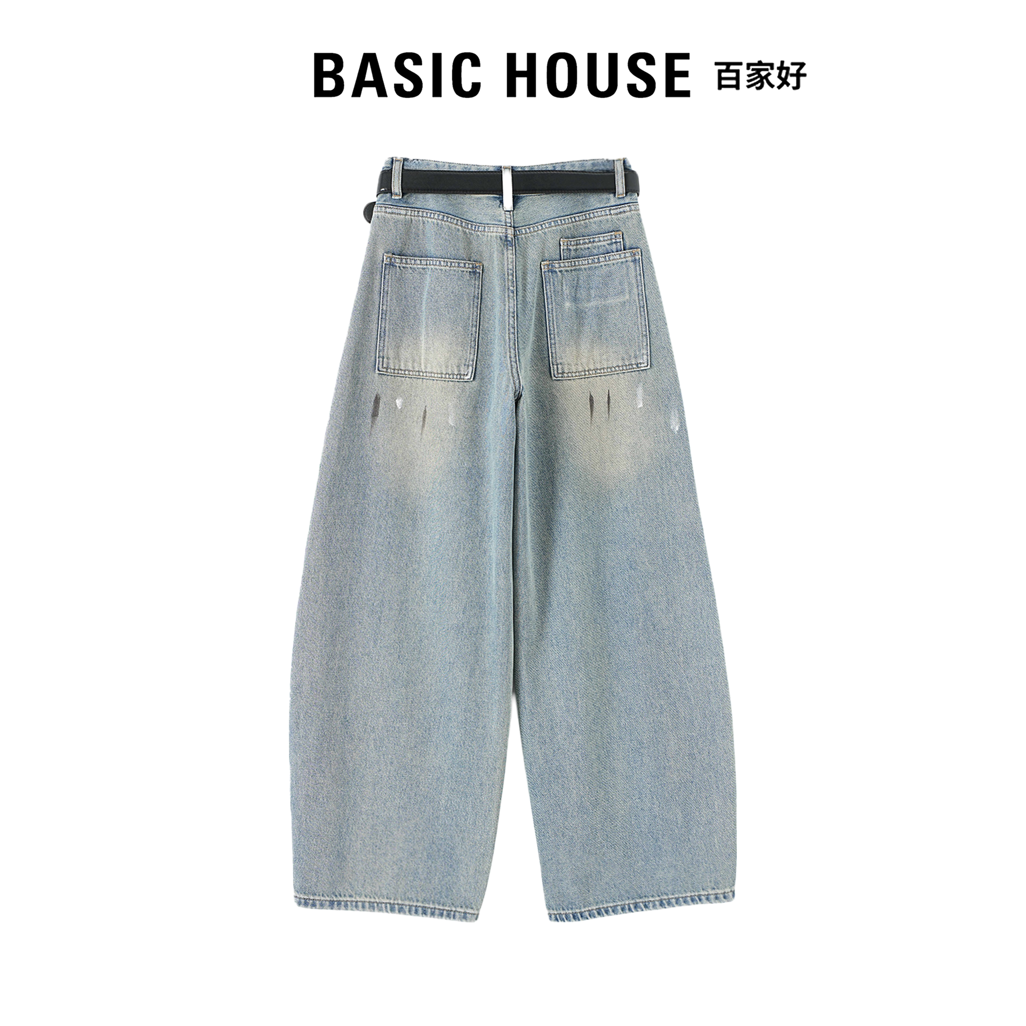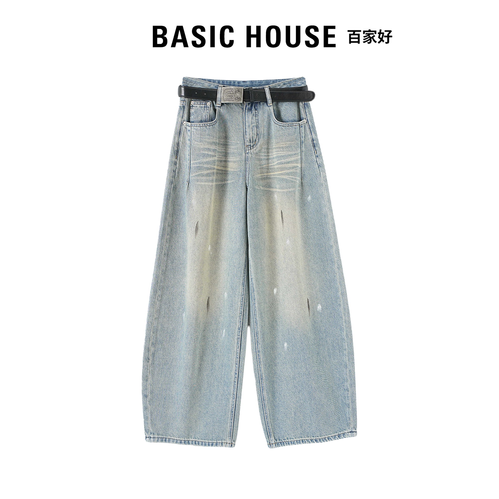 女高个子显瘦阔腿长裤 Basic House百家好泼墨涂鸦蓝色弯刀牛仔裤