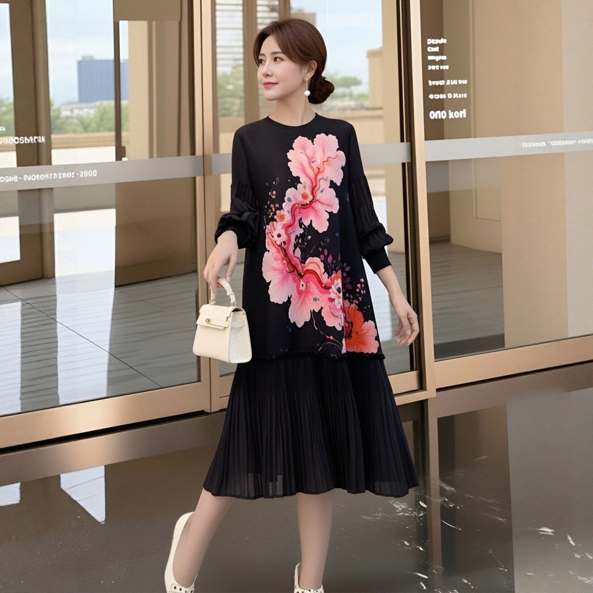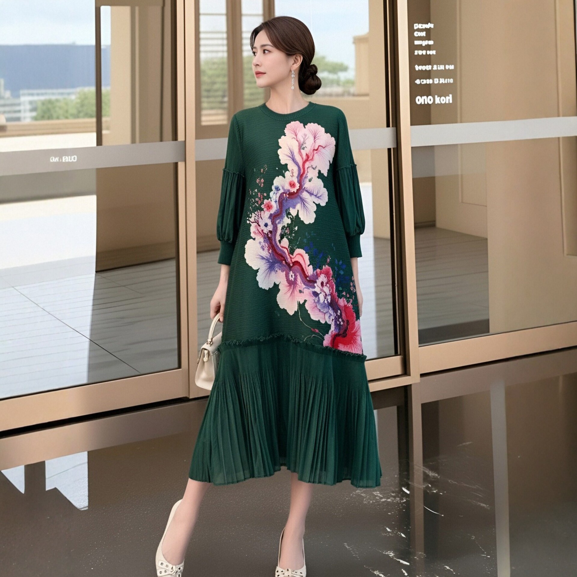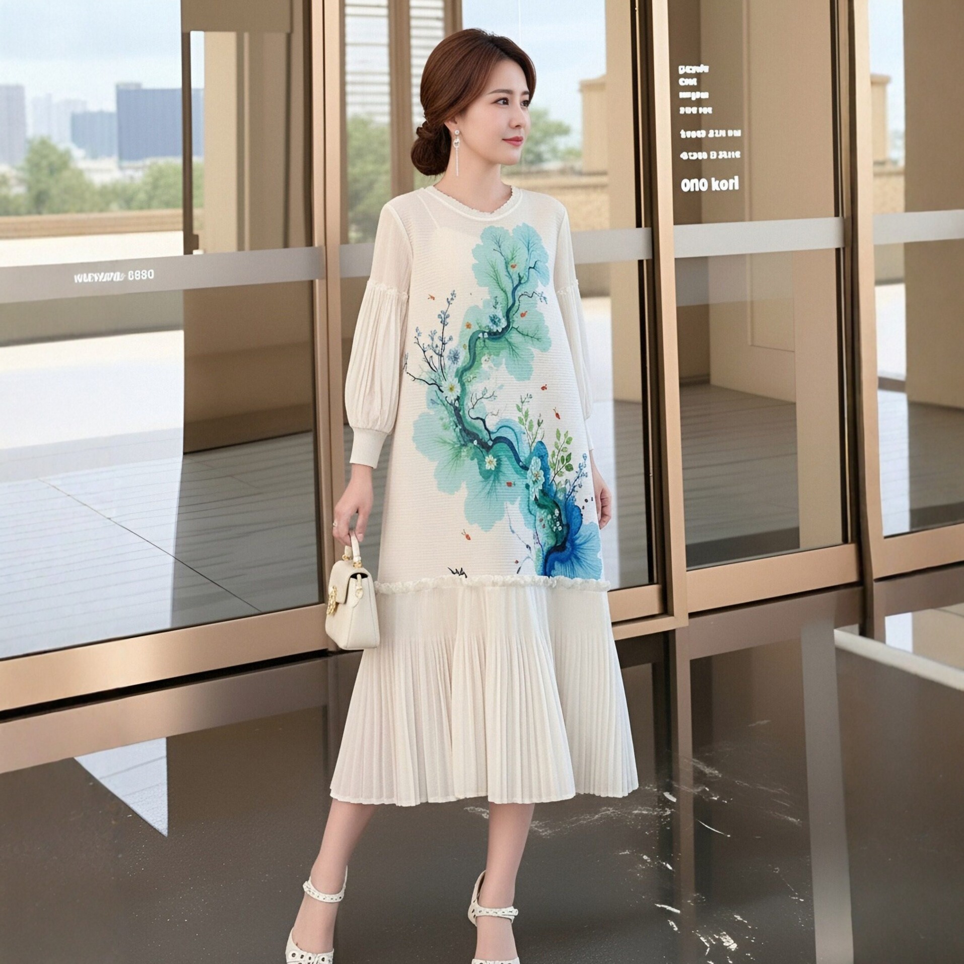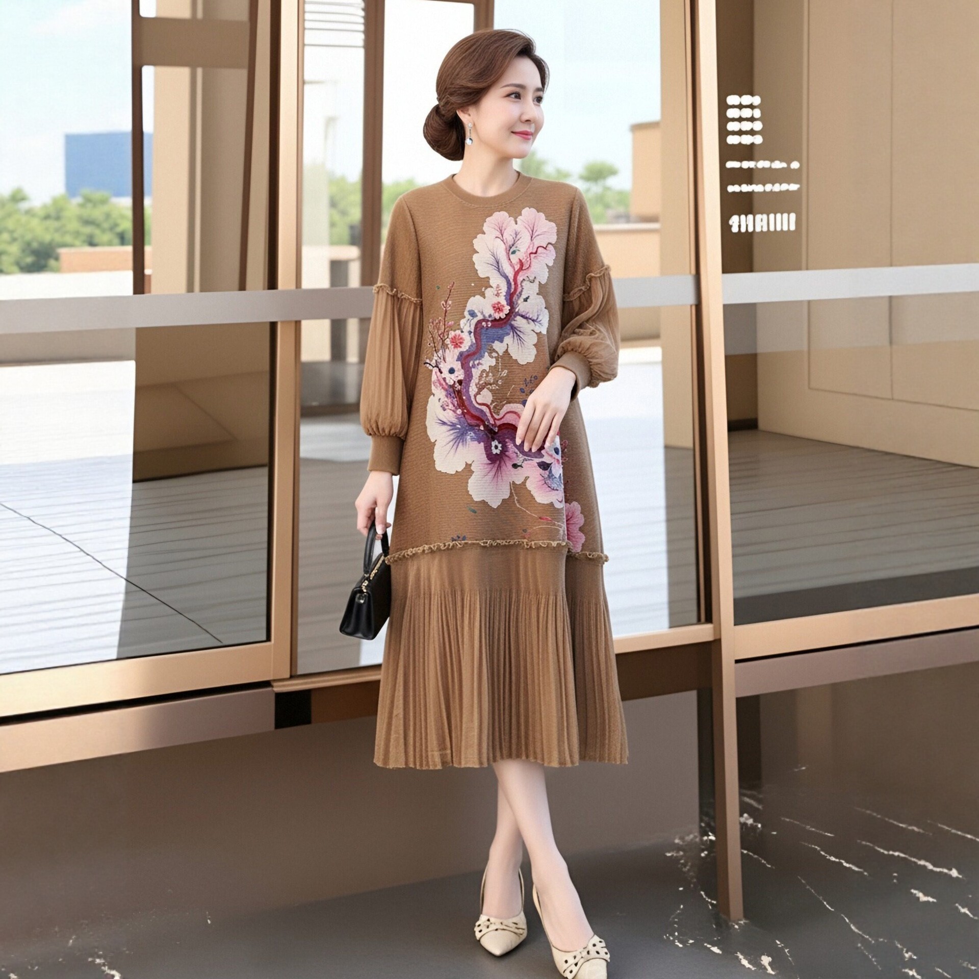 褶皱宽松遮肚显瘦A字中长裙 国风连衣裙2026早春新款 59岁妈妈装