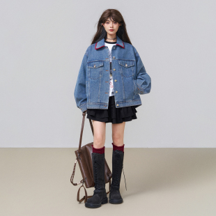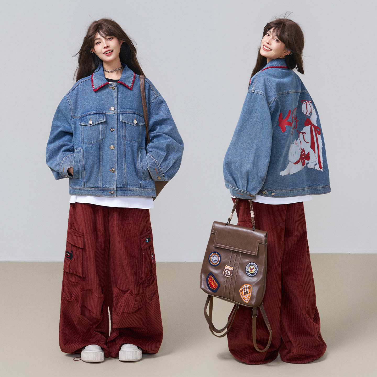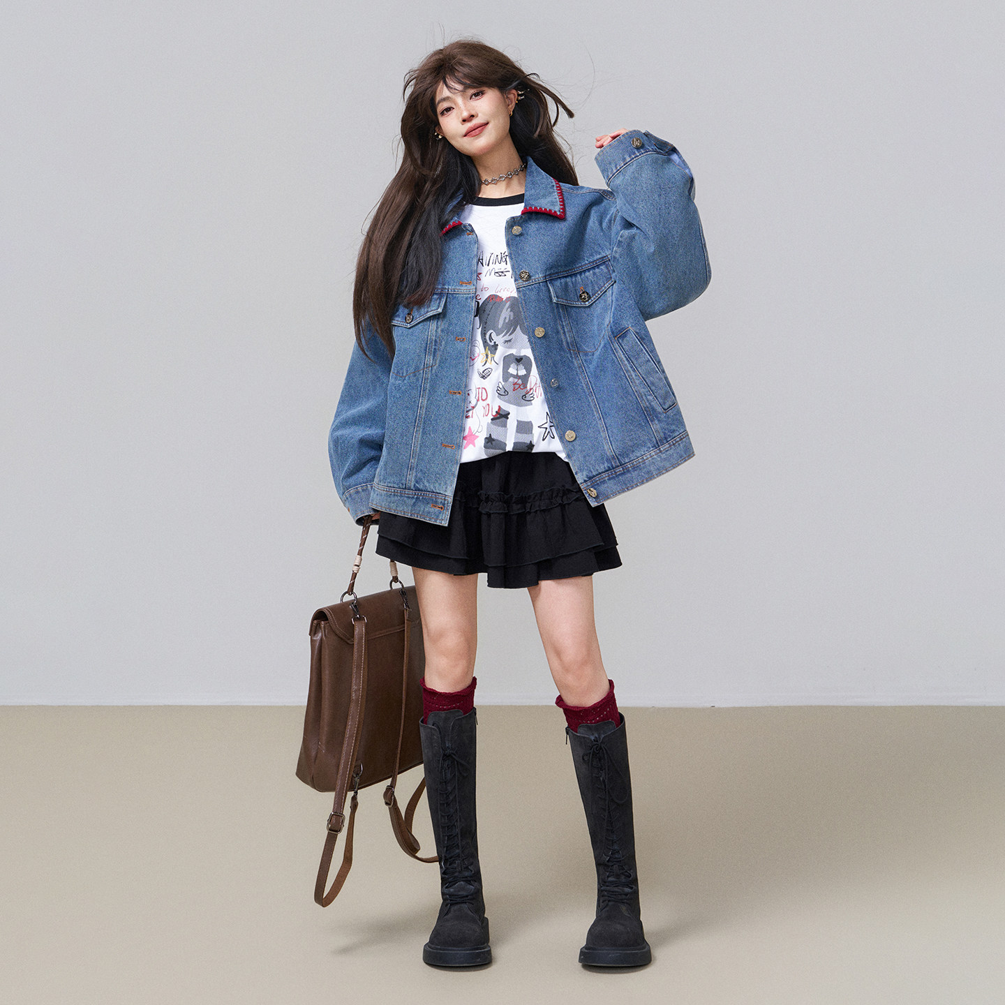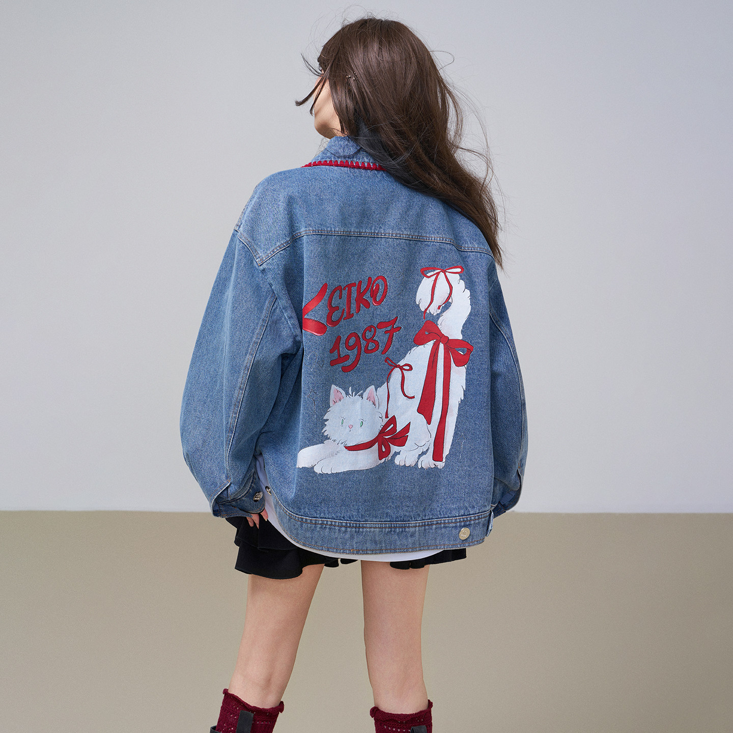 KEIKO 复古撞色机绣锁边翻领休闲夹克 甜系印花宽松牛仔外套女春季