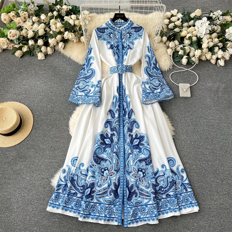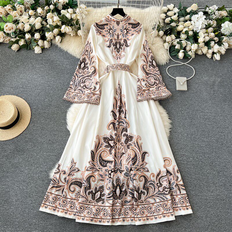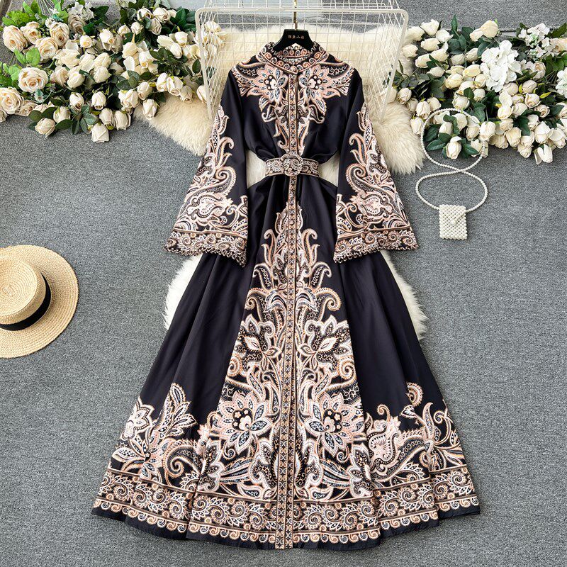 速发复古轻奢宫廷风印花连衣袖 收气裙设计感小众腰质长裙 秋冬季