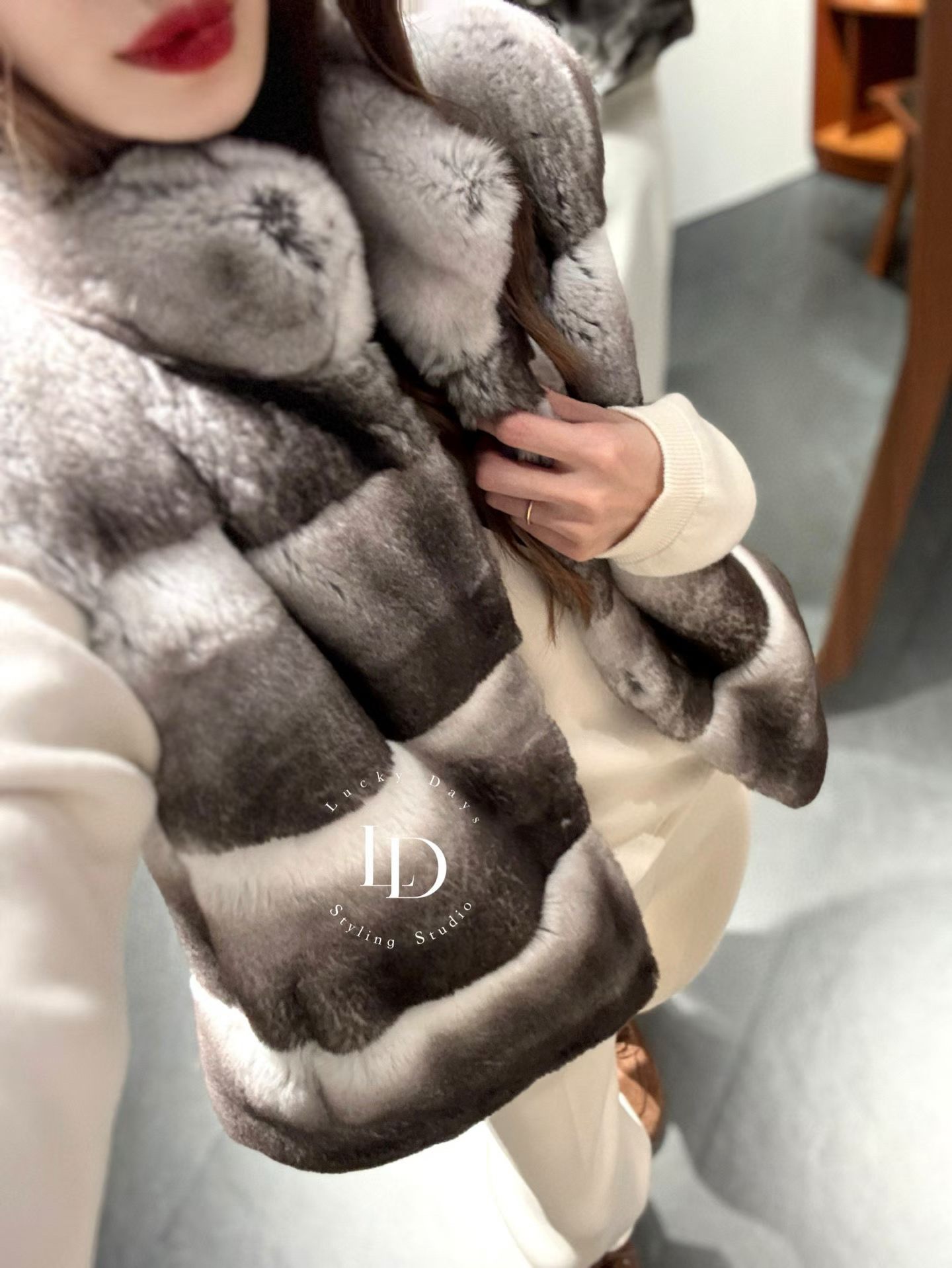 灰色蝴蝶结毛毛立领外套女款 皮毛一体高级感保暖环保皮草大衣 冬季