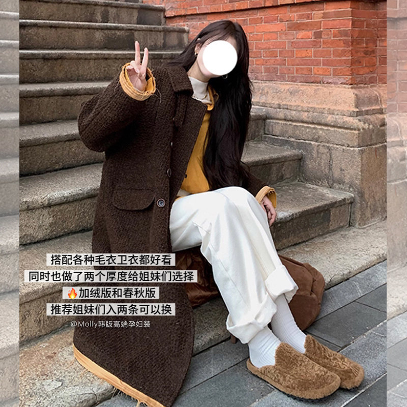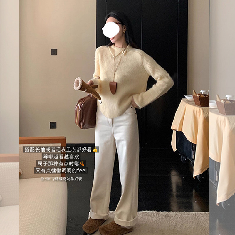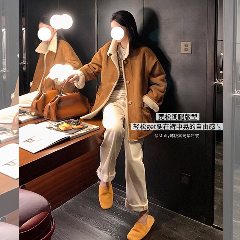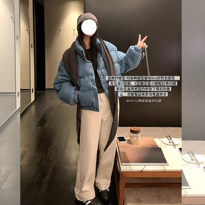 宽松休闲直筒阔腿拖地裤 孕妇白色加绒牛仔裤 秋冬外穿加绒加厚时尚