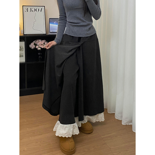 子 胖妹妹mm遮胯显瘦阔腿休闲裤 深灰色蕾丝花边毛呢裙裤 女秋冬新款