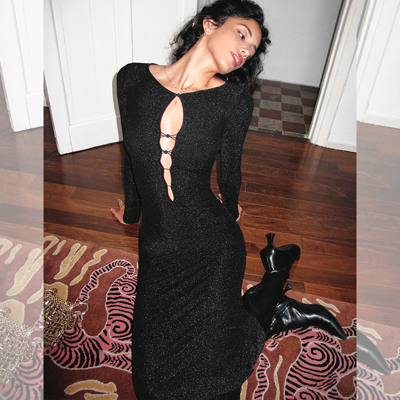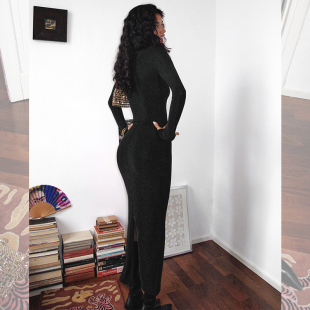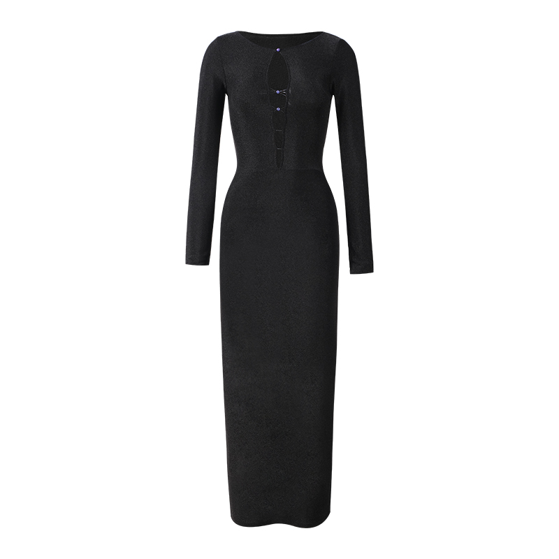 摩登黑色V领连衣裙女性感长袖 ITSNIKAR 针织包臀裙子