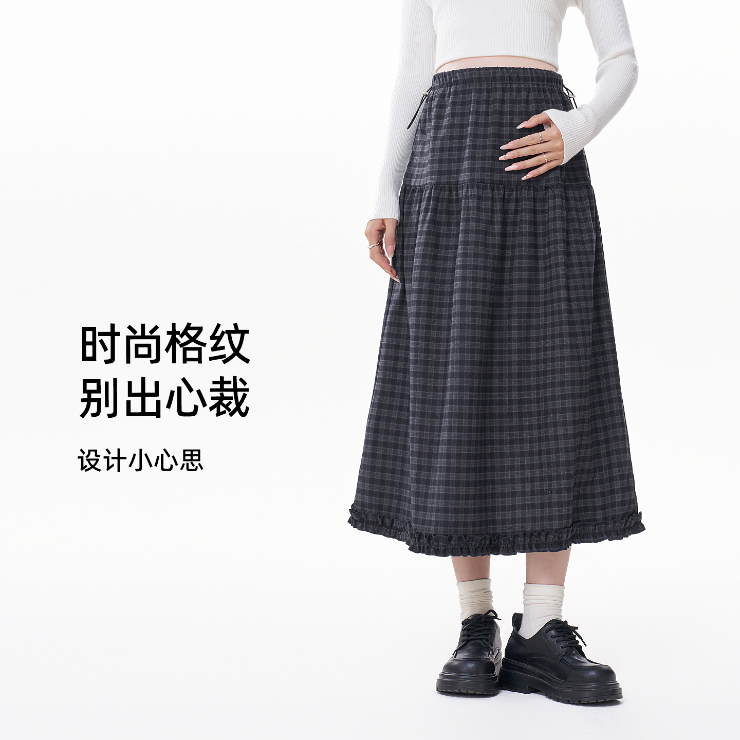 509092 气质流苏摆不规则半身裙子女装 三福格子长裙女2025新款 冬季