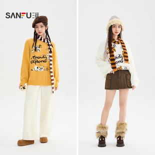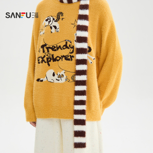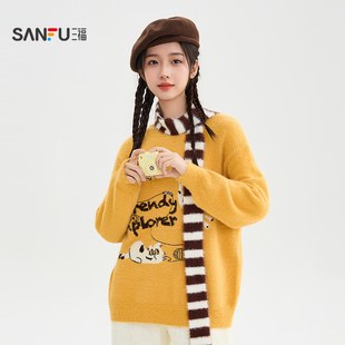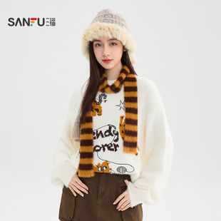 三福套头毛衣秋冬女2025新款 511628 条纹围巾猫咪绣花宽松上衣女装