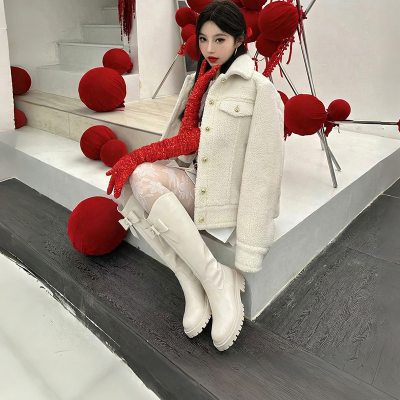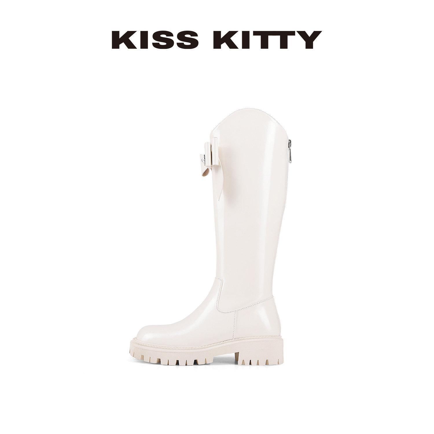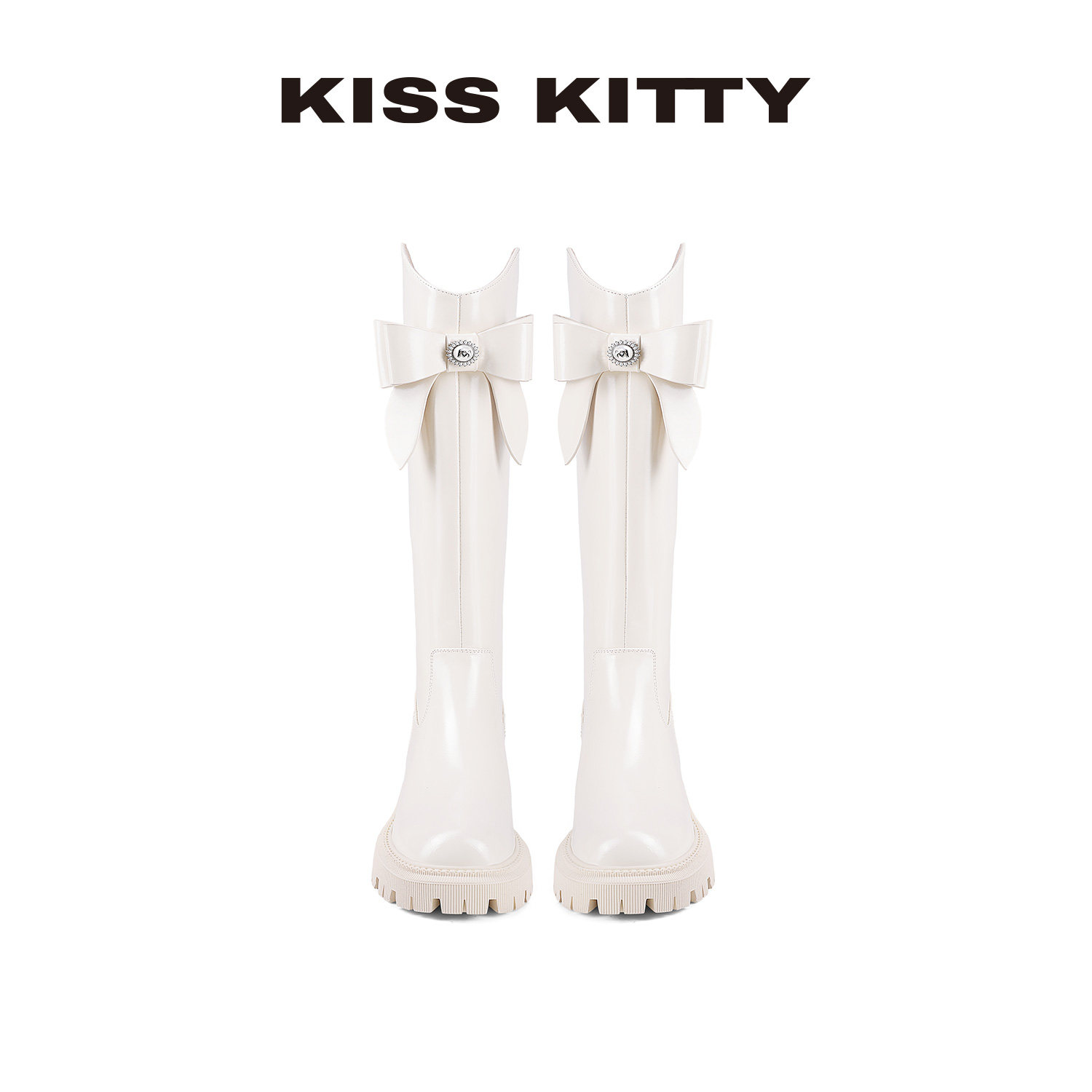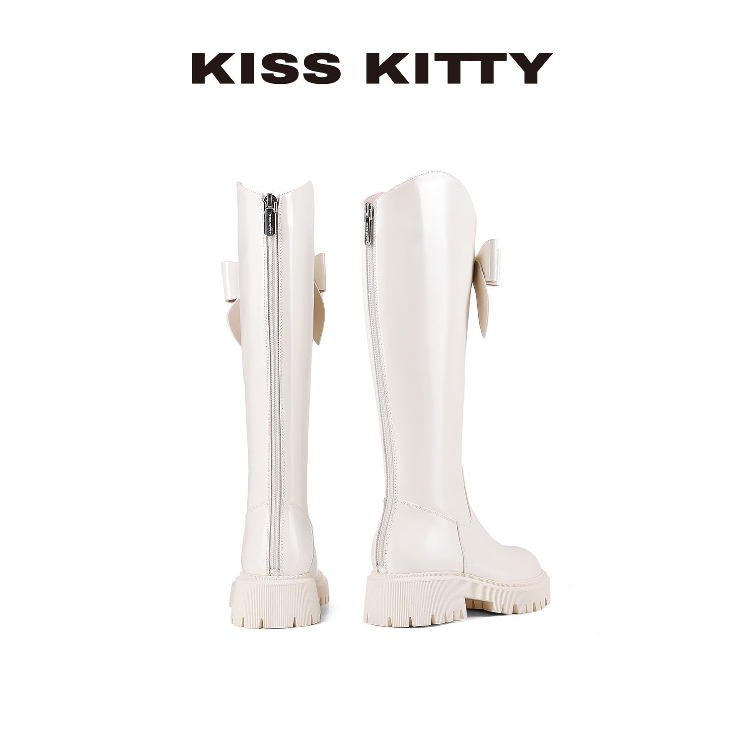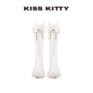 KISSKITTY蝴蝶结长筒皮靴冬季 高筒靴圆头粗跟厚底增高骑士靴 新款