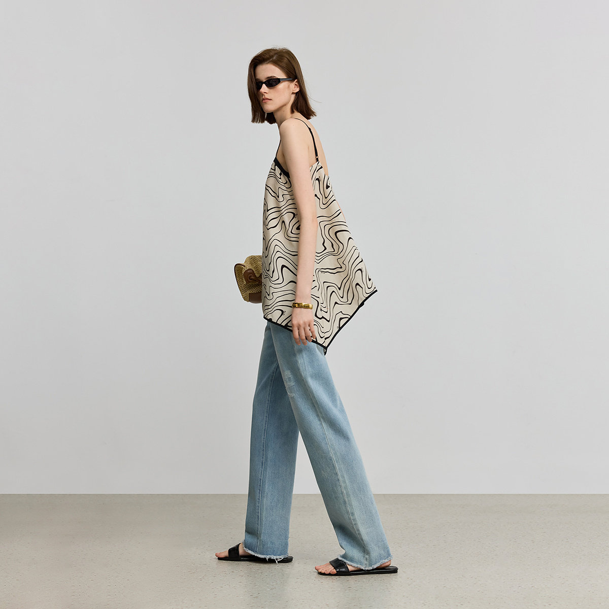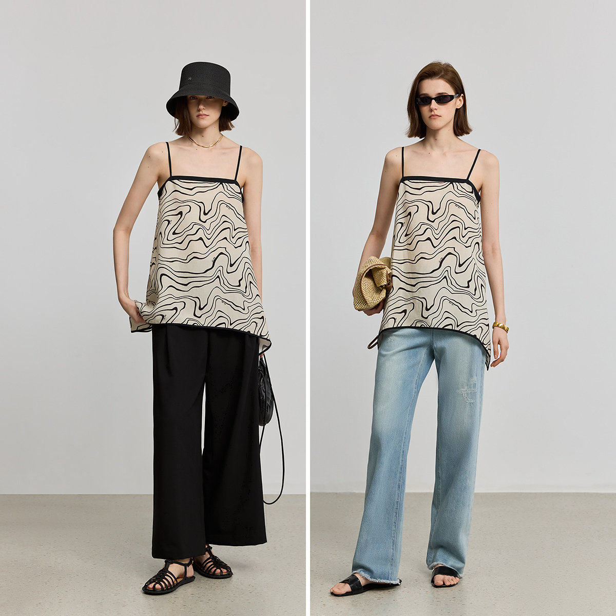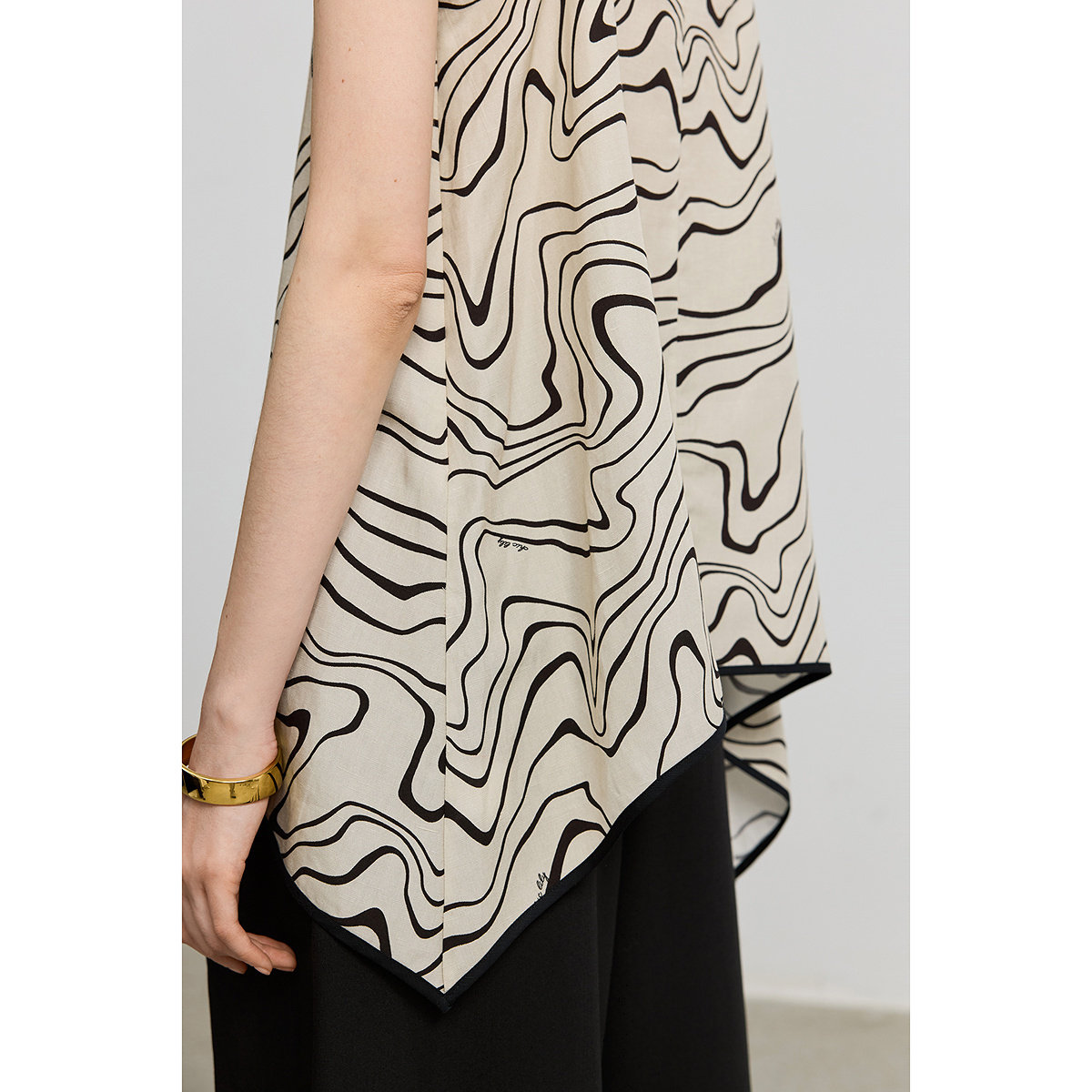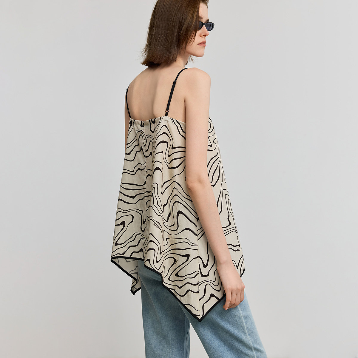 LILY2026夏新款 女 莱赛尔亚麻波浪不规则下摆撞色边吊带背心雪纺衫