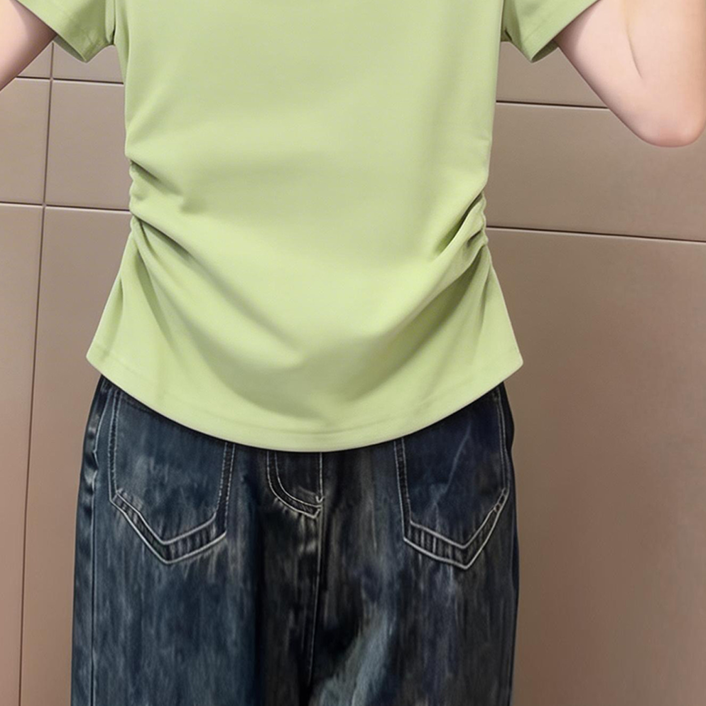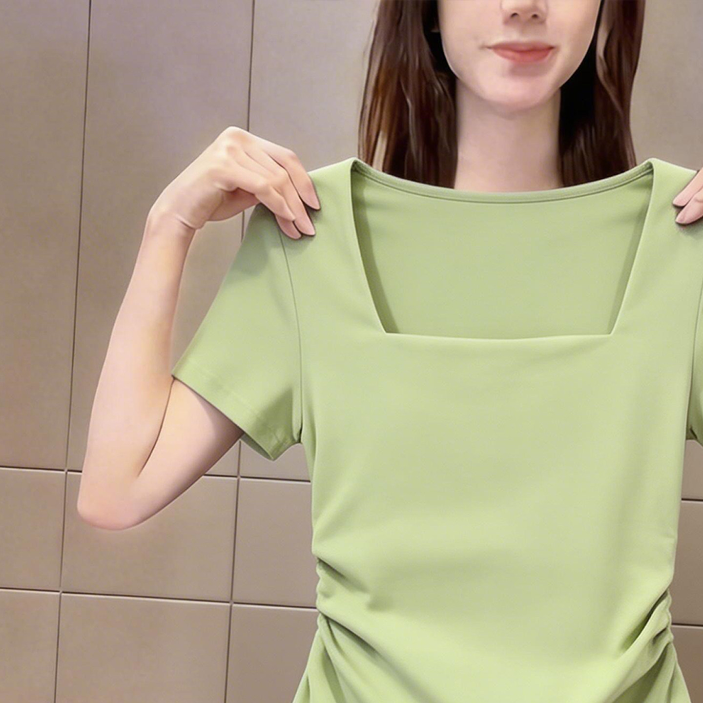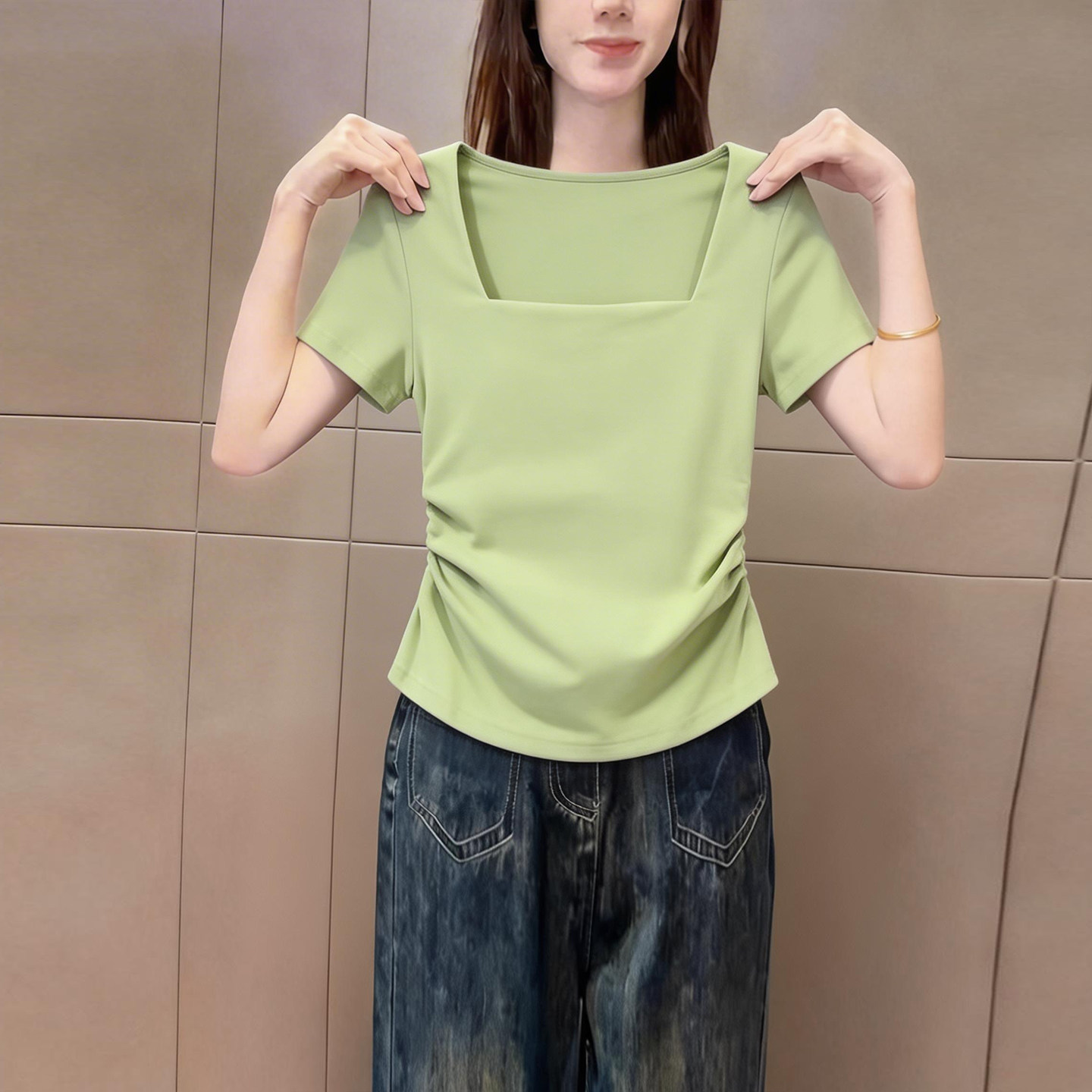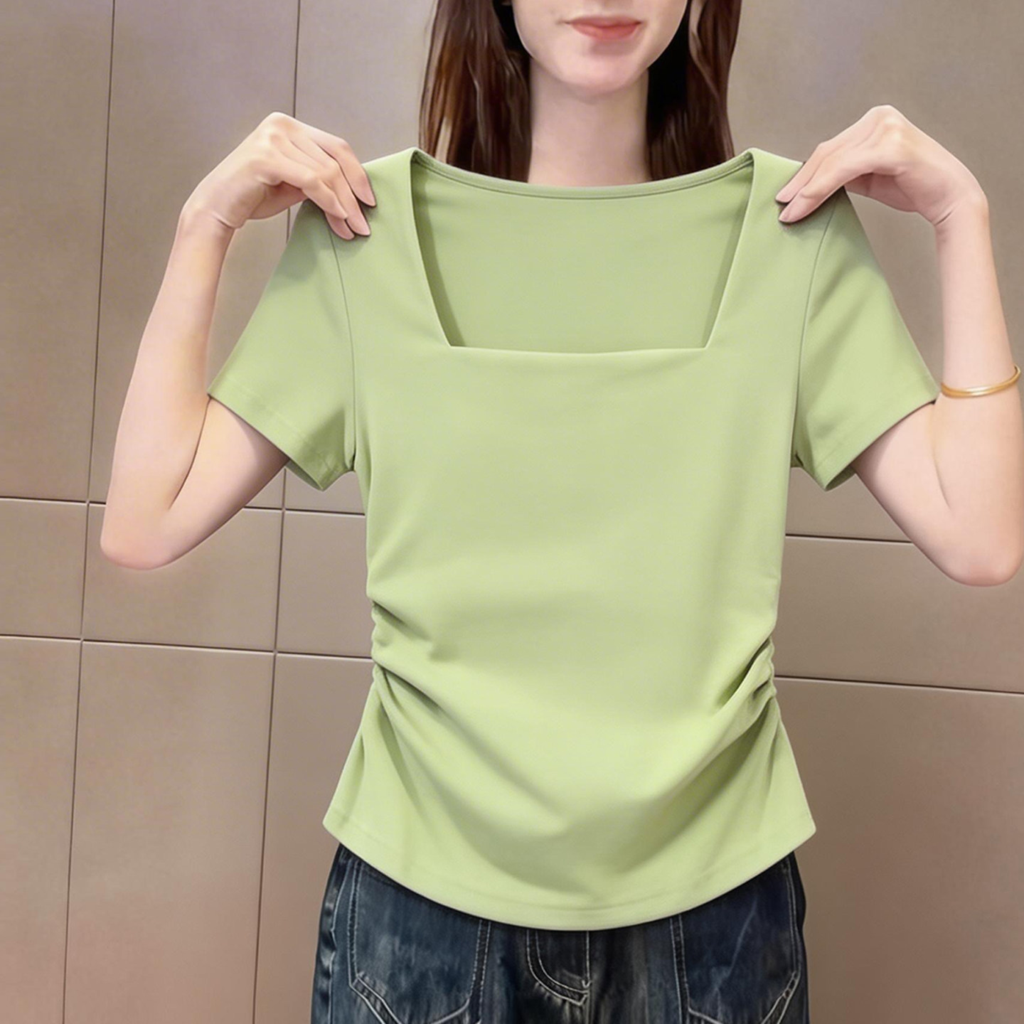 新品 2026夏季 收腰捏褶休闲气质上衣 t恤女装 绿色高级纯色方领短袖