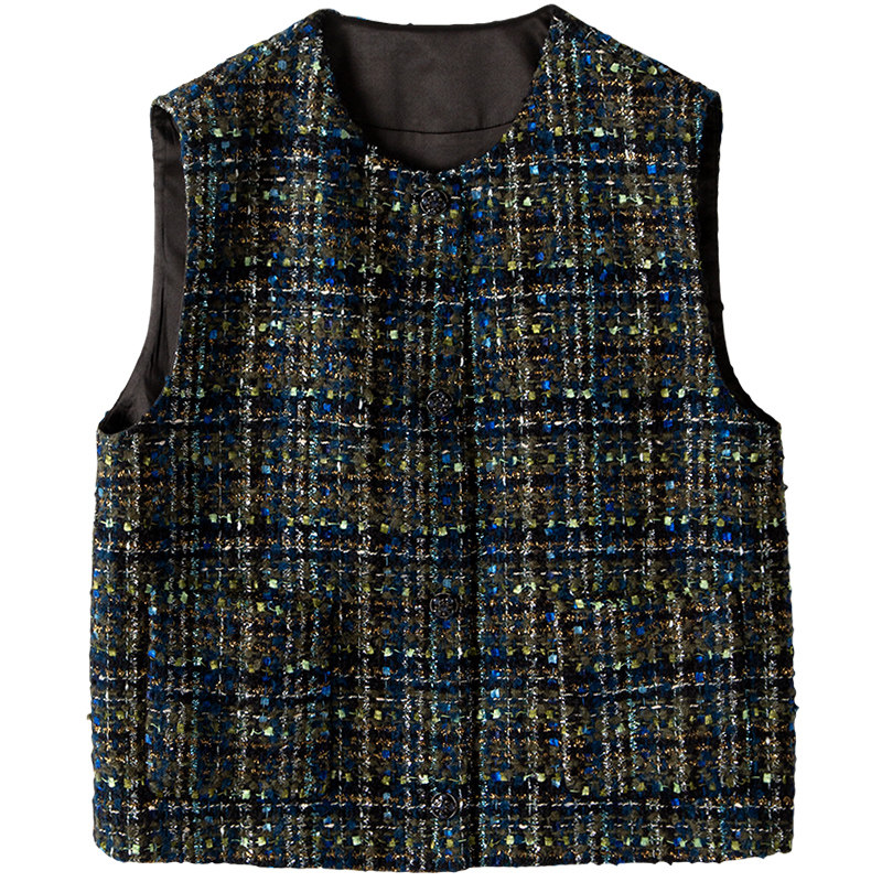富家千金氛围感小香风粗花呢羊毛混纺彩色金线圆领宽松马甲女上衣