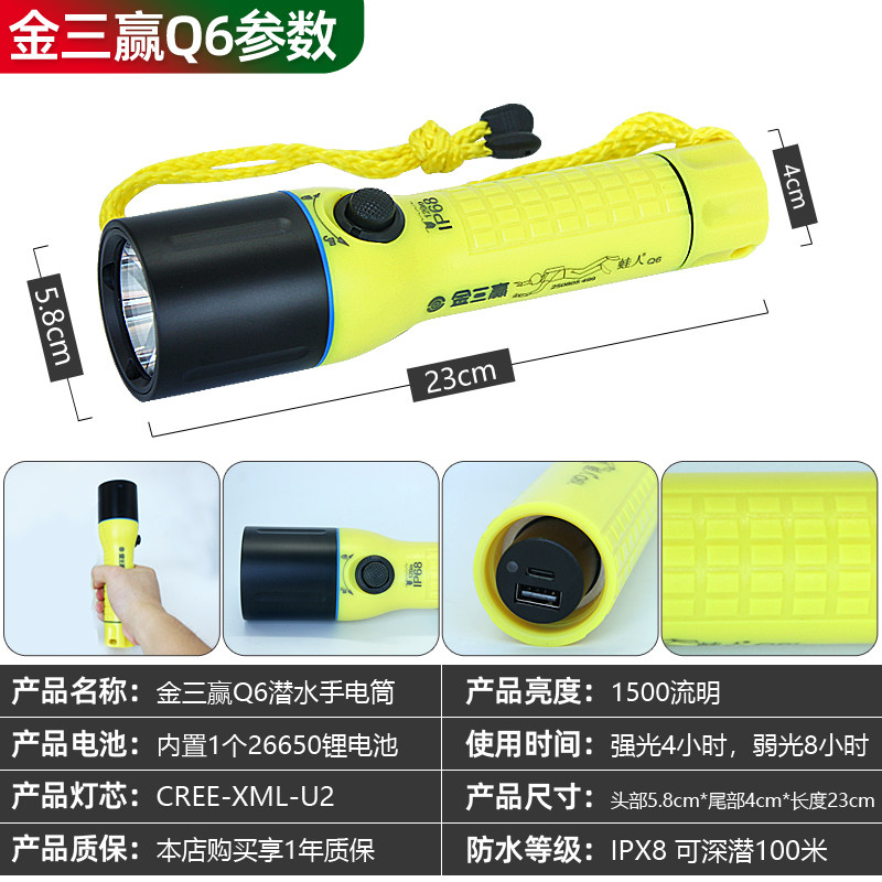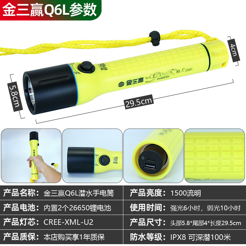 金三赢Q6L Q6专业潜水手电筒户外防水LED强光充电水下夜潜照明灯
