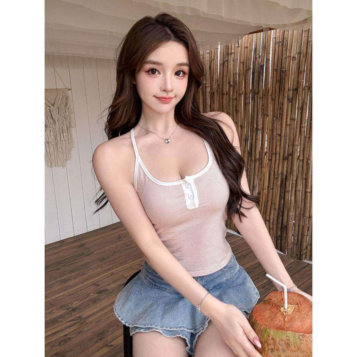 显瘦设计感短款 韩系修身 条纹撞色露背U领吊带背心女 新款 春夏季