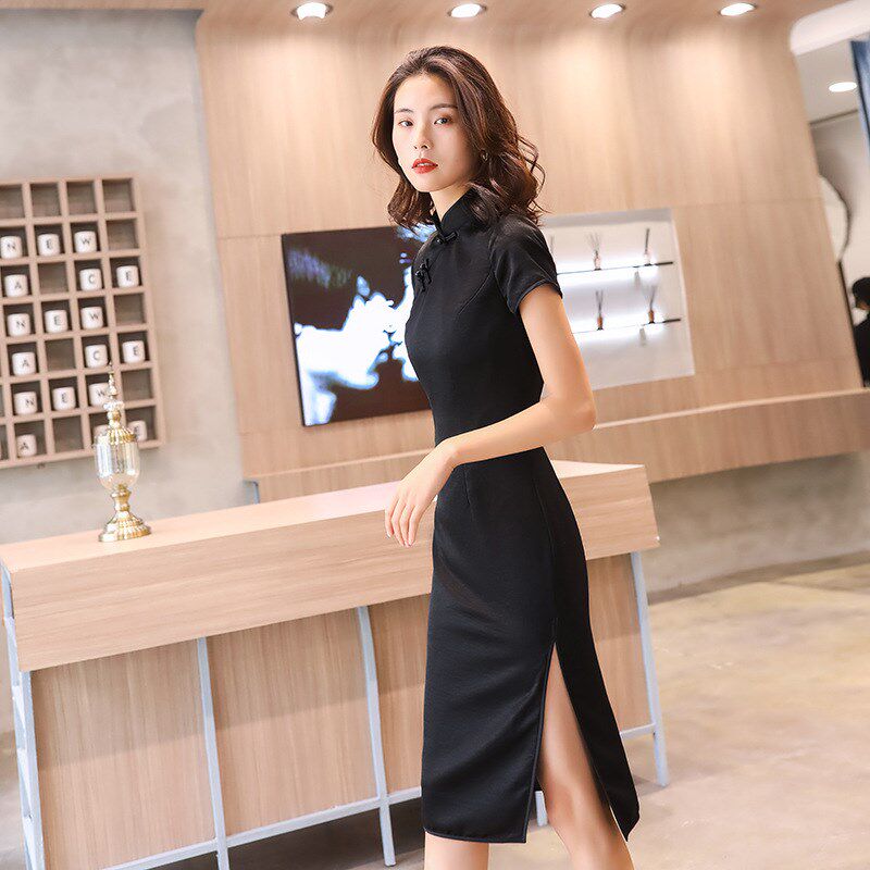 优雅气质旗袍连衣裙 醋酸缎有加里双层纯色黑色中长款 2020春季 新款