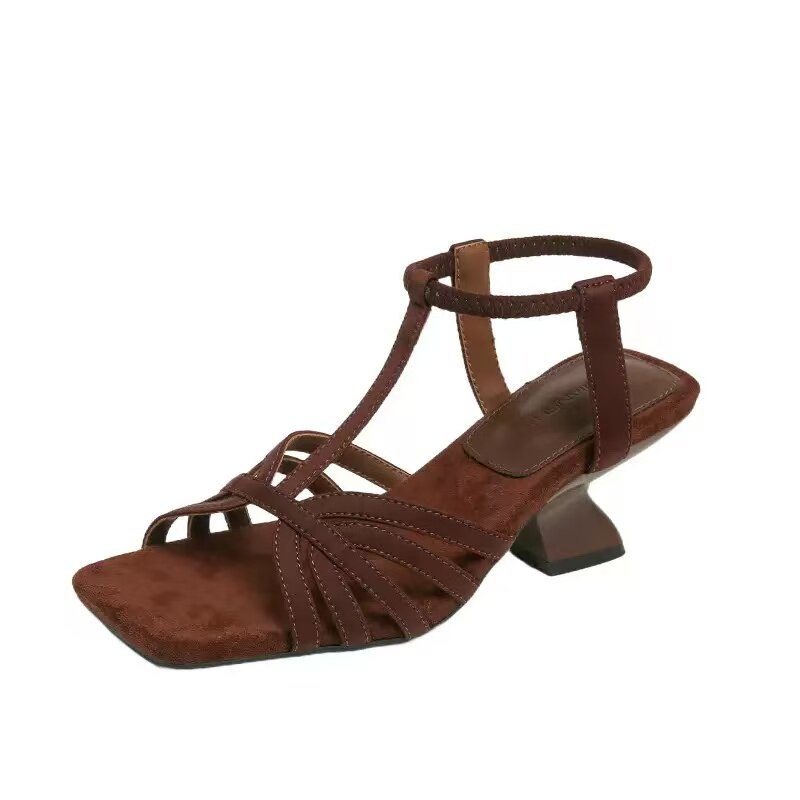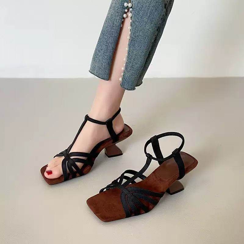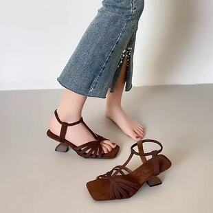 百搭露趾方头编织一字带高跟鞋 新款 女 女2026夏季 小众坡跟罗马凉鞋