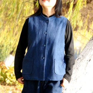 石头记柜中缘原创新中式 马甲休闲帅气背心深蓝色提花亚麻棉女春秋