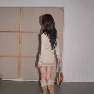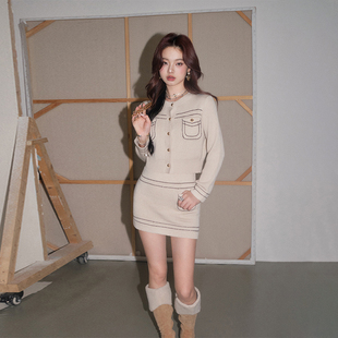 小香风拼色金扣开衫 DUO线条针织套装 OLIVIA 半身裙两件套 现货
