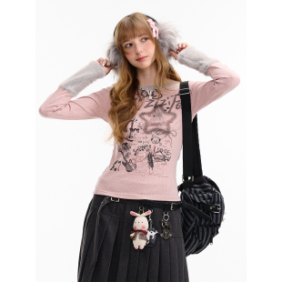 拼接毛绒涂鸦印花圆领针织打底衫 设计感修身 女 美式 ziziFei秋冬季