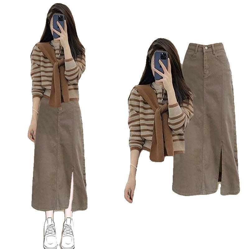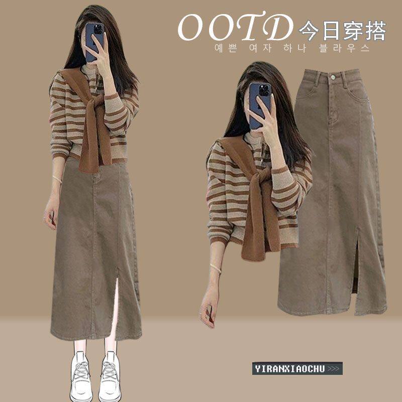 韩系氛围感穿搭女2024新款 半身裙三件 洋气减龄披肩条纹针织衫
