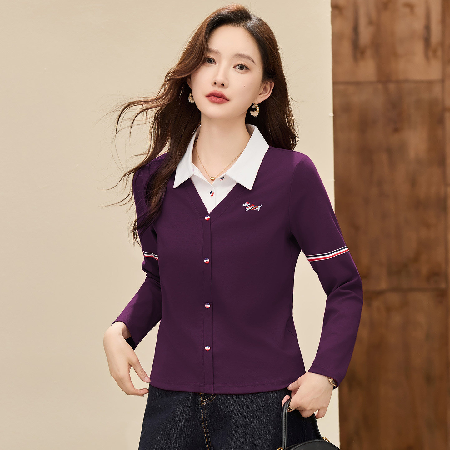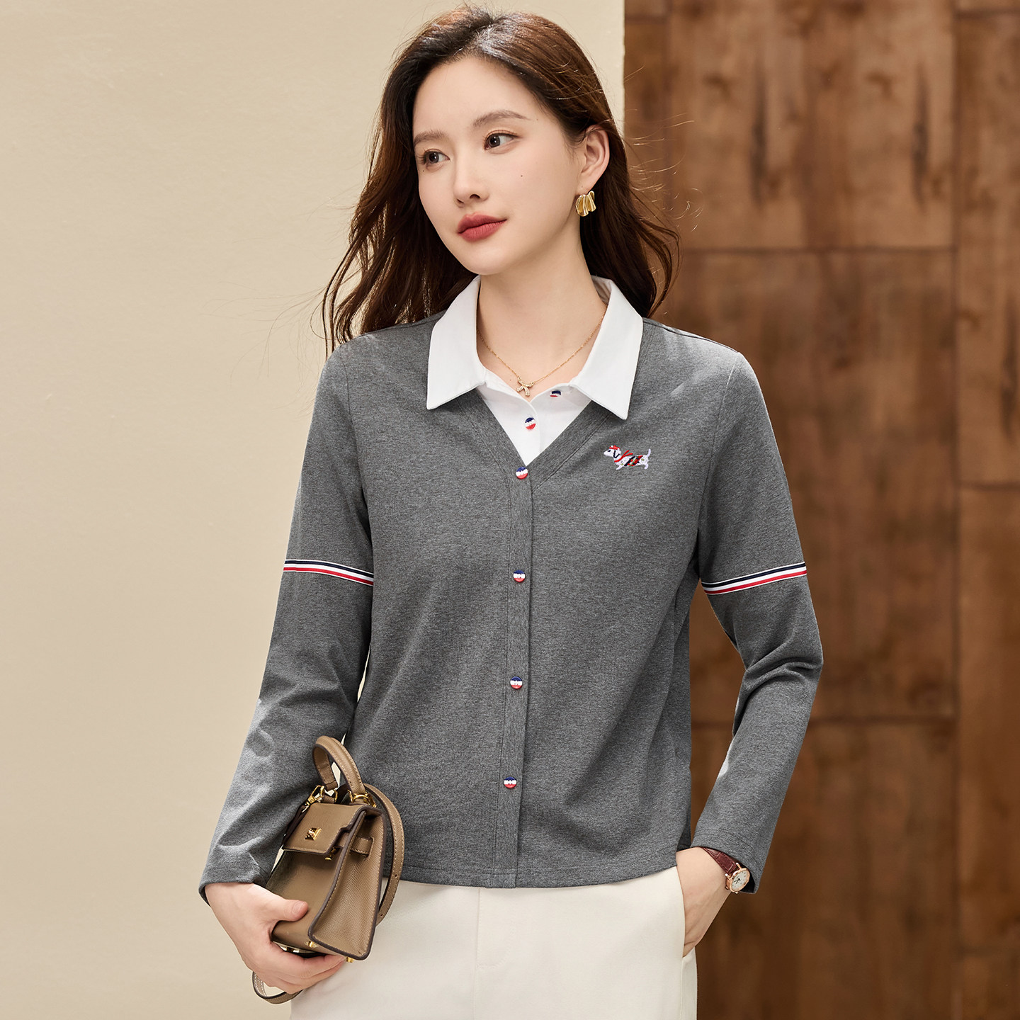 t恤女2025新款 洋气薄打底衫 早秋爆款 假两件上衣时尚 女装 翻领长袖