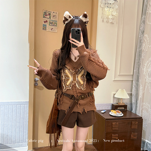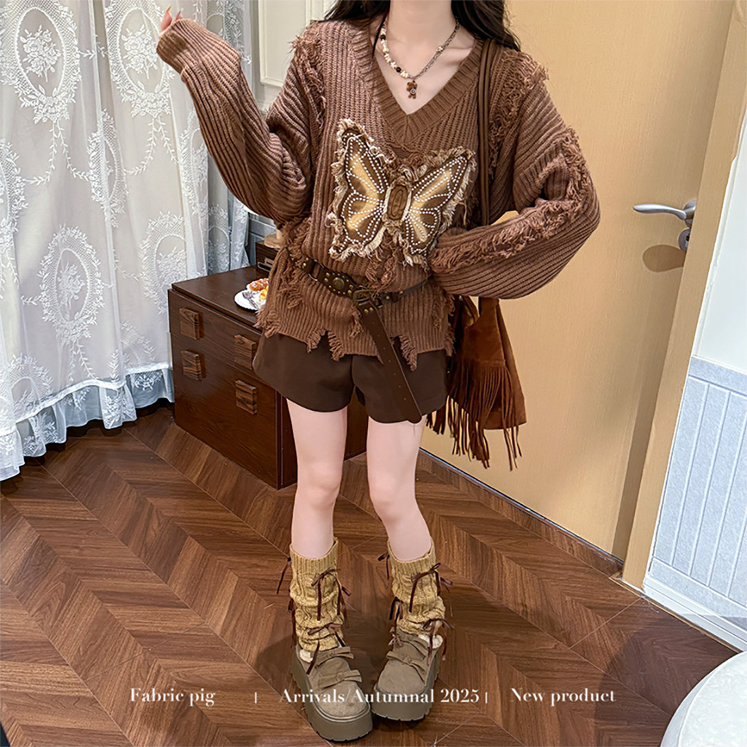 慵懒风棕咖色V领毛衣女秋冬美拉德贴布针织衫 织物猪 蝴蝶可颂