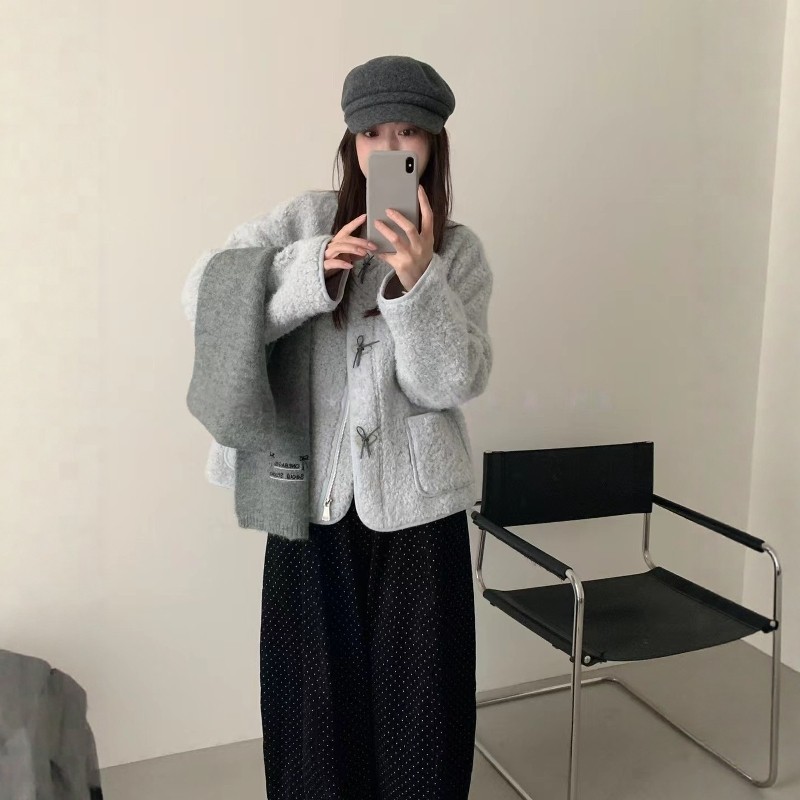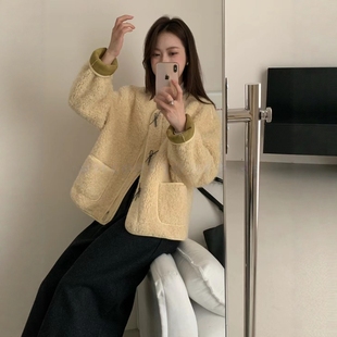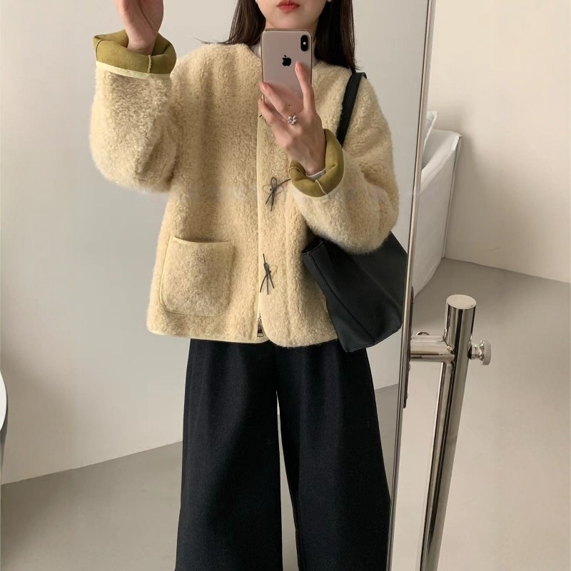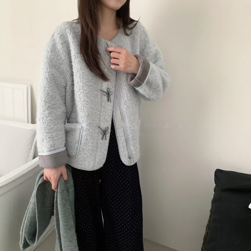 宽松显瘦外套女蝴蝶结扣圆领百搭皮毛一体上衣 韩版 2025冬季 新款