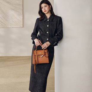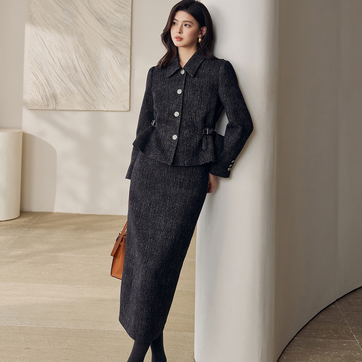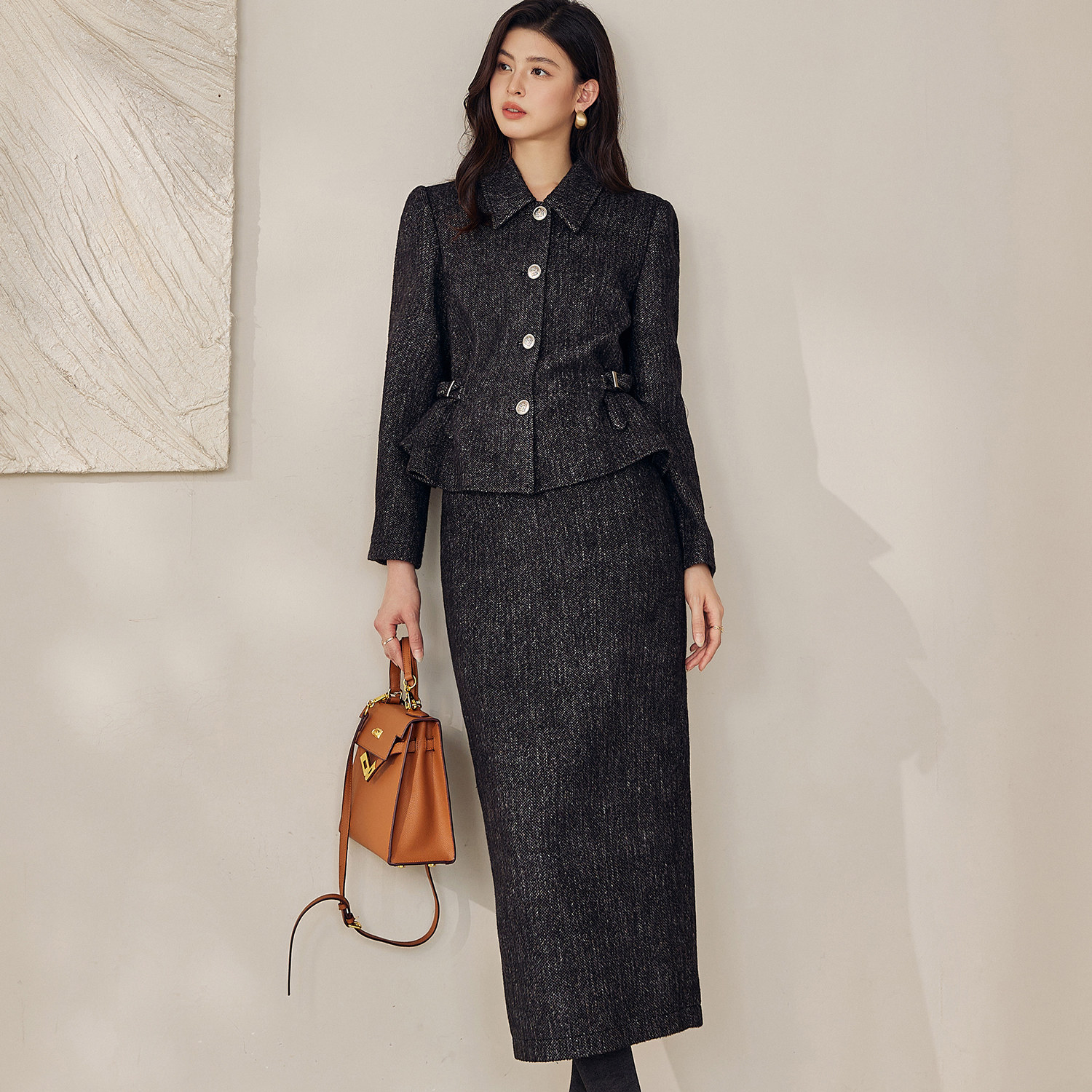 罗衣职场设计感收腰时尚 女冬毛呢外套半身裙两件套套裙13115 套装