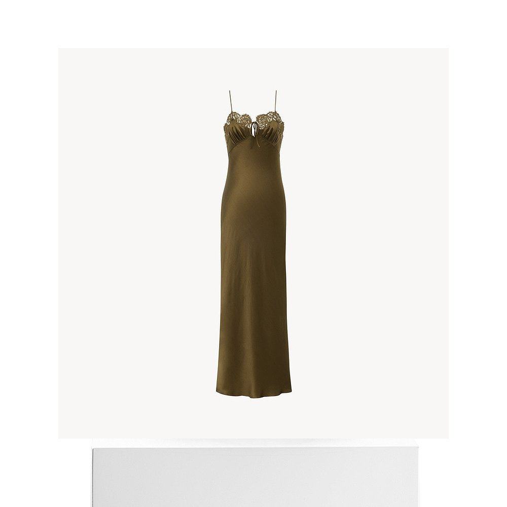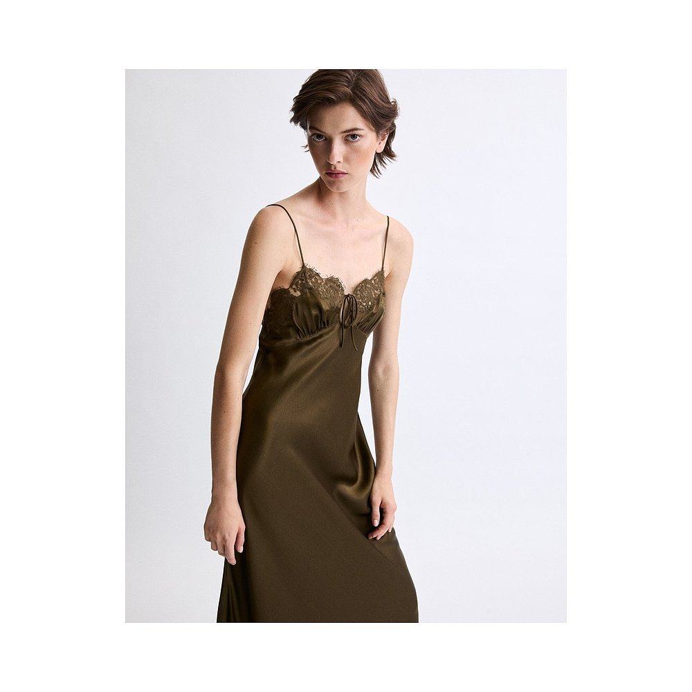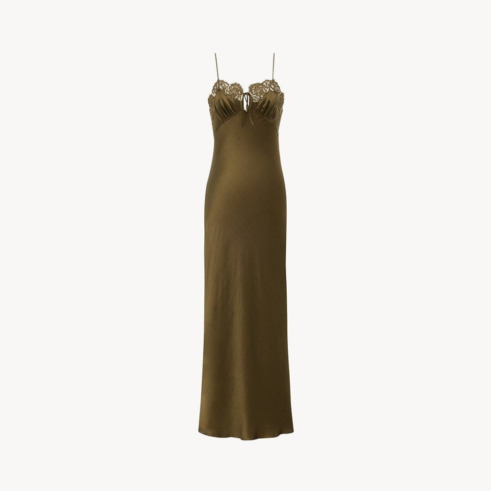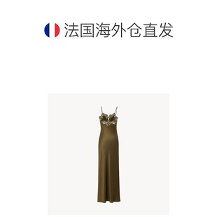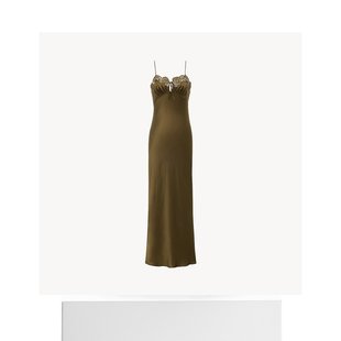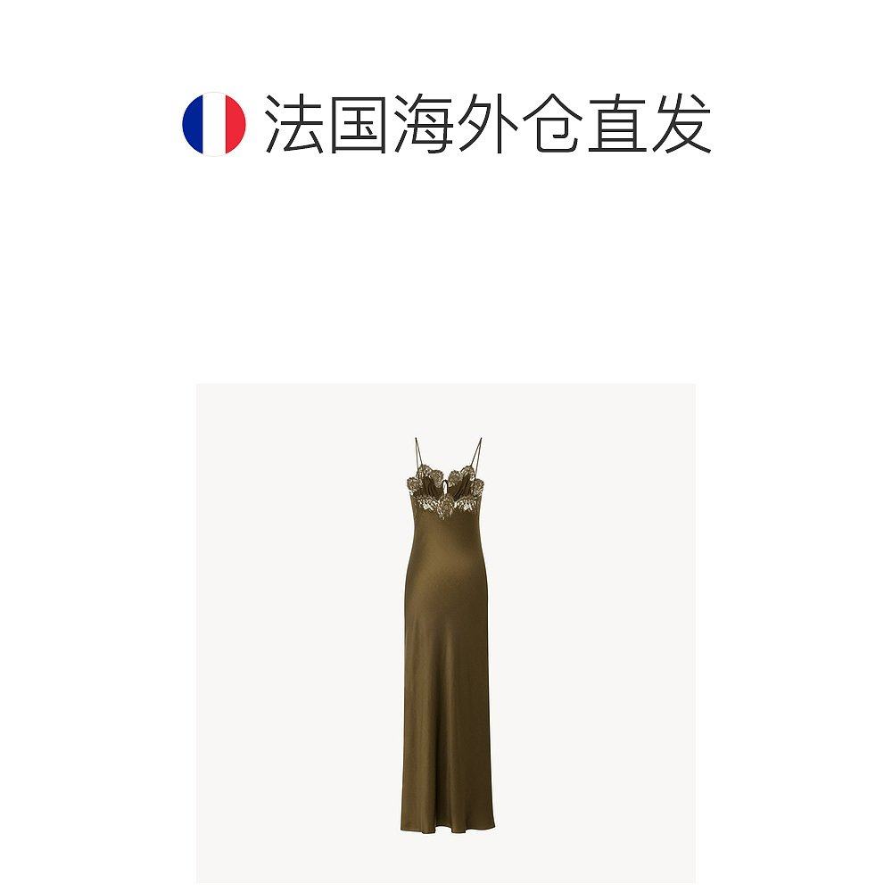 自营欧洲直邮YSL圣罗兰 连衣裙 女士卡其色真丝荷叶边蕾丝镶边无袖
