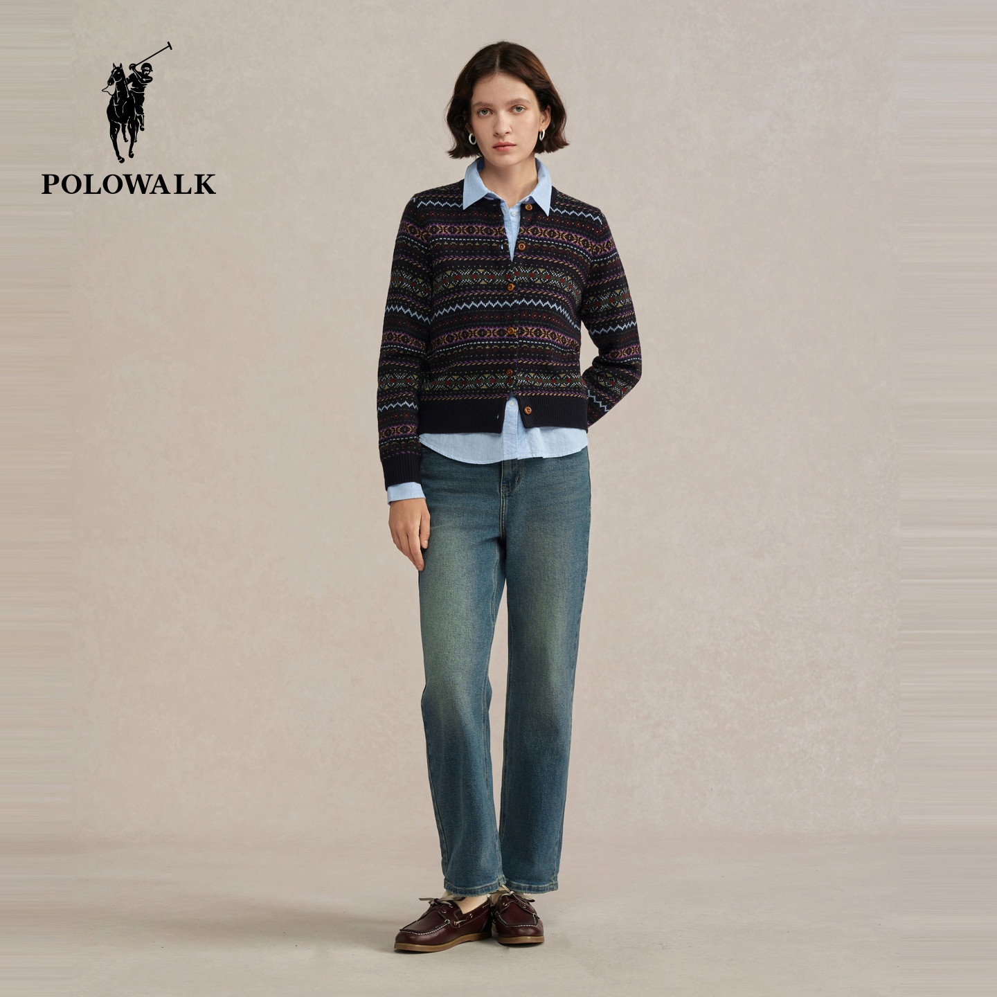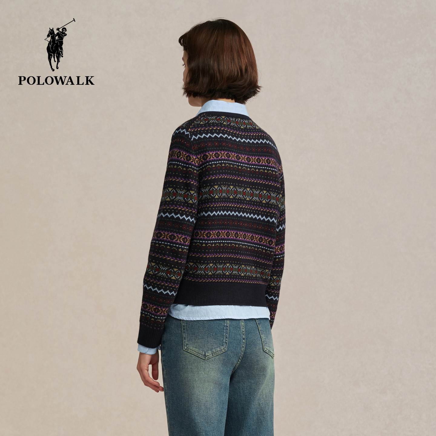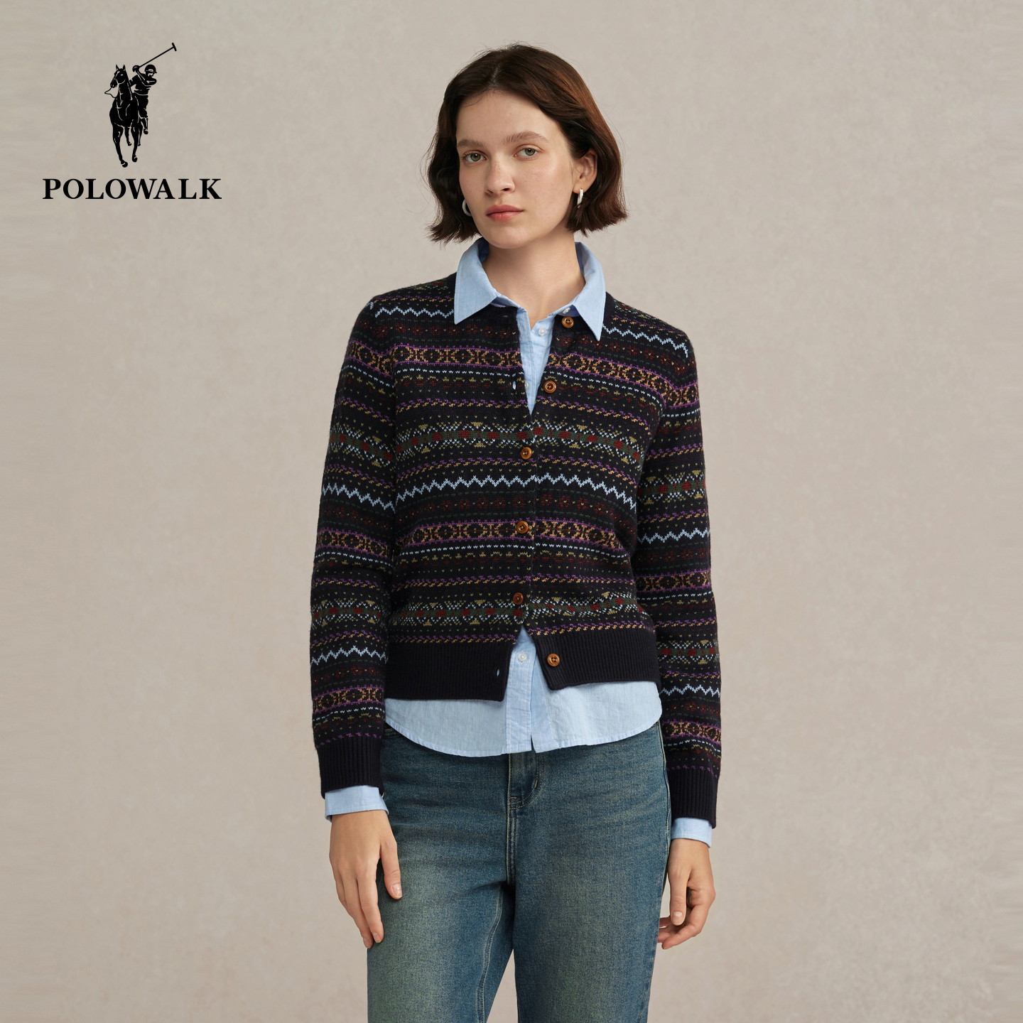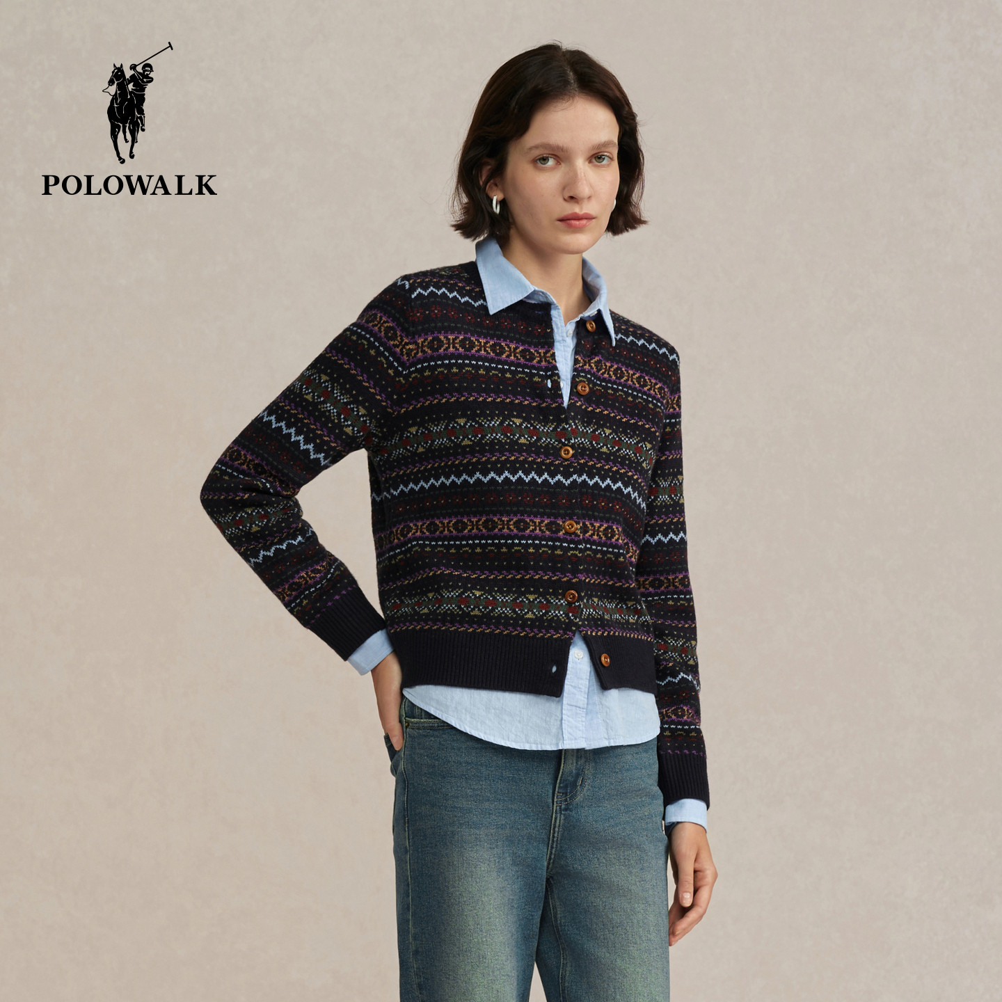 长袖 复古民族风提花圆领针织开衫 针织衫 新品 2025秋季 POLOWALK女式