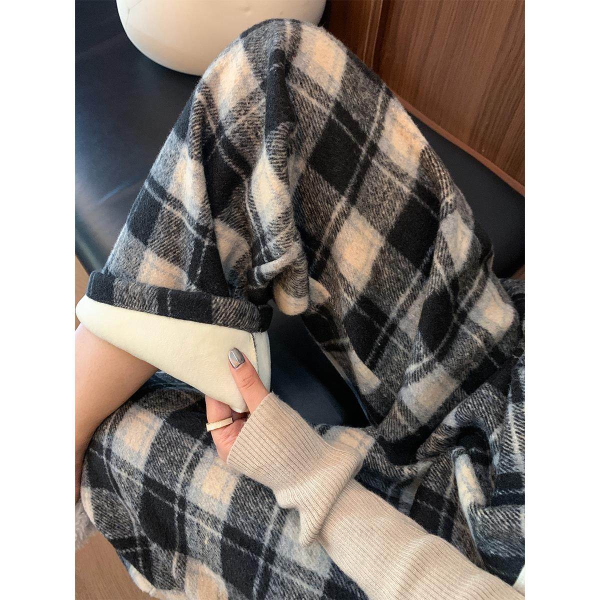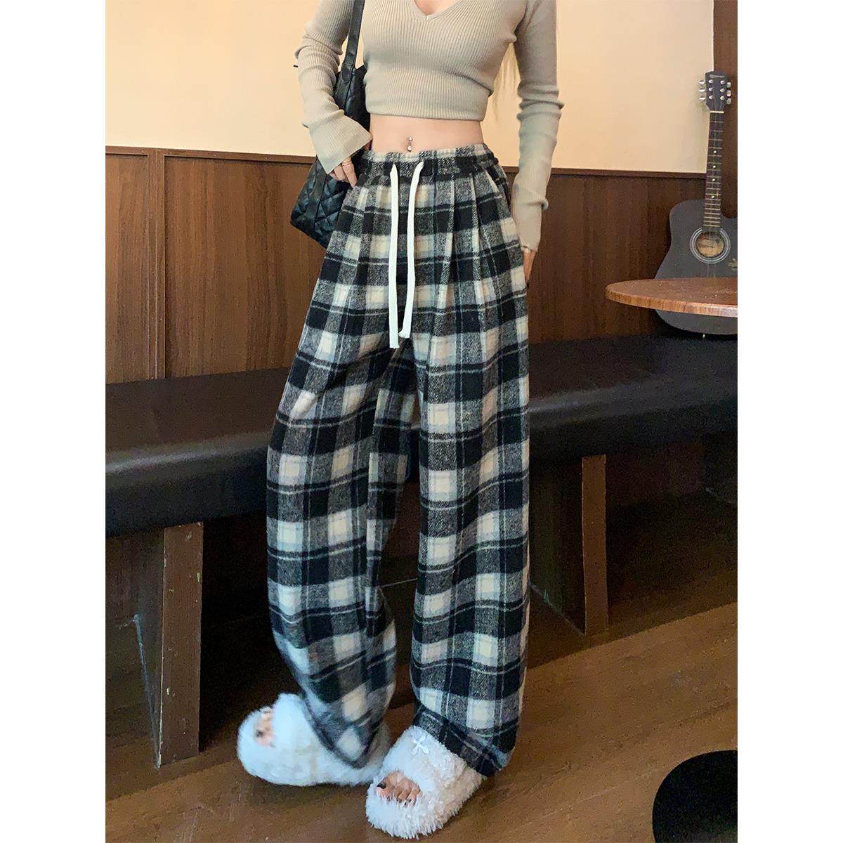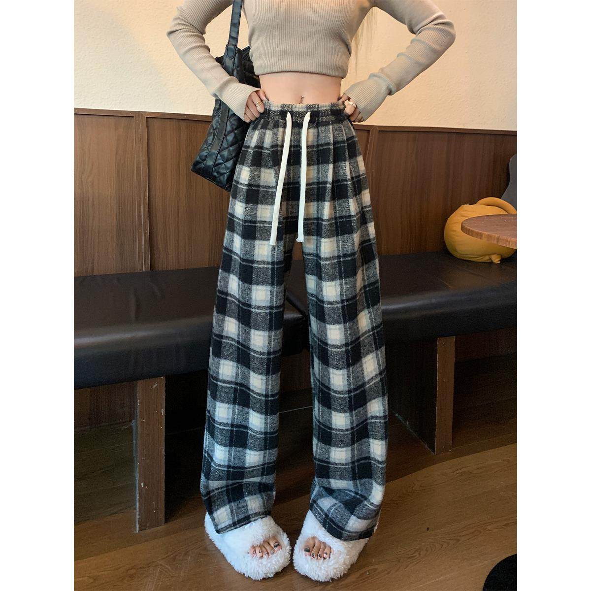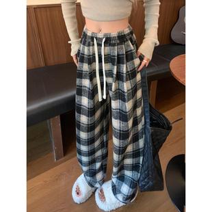 子 复古毛呢阔腿休闲加厚直筒羊毛裤 PLER加绒格子裤 女2025秋冬新款