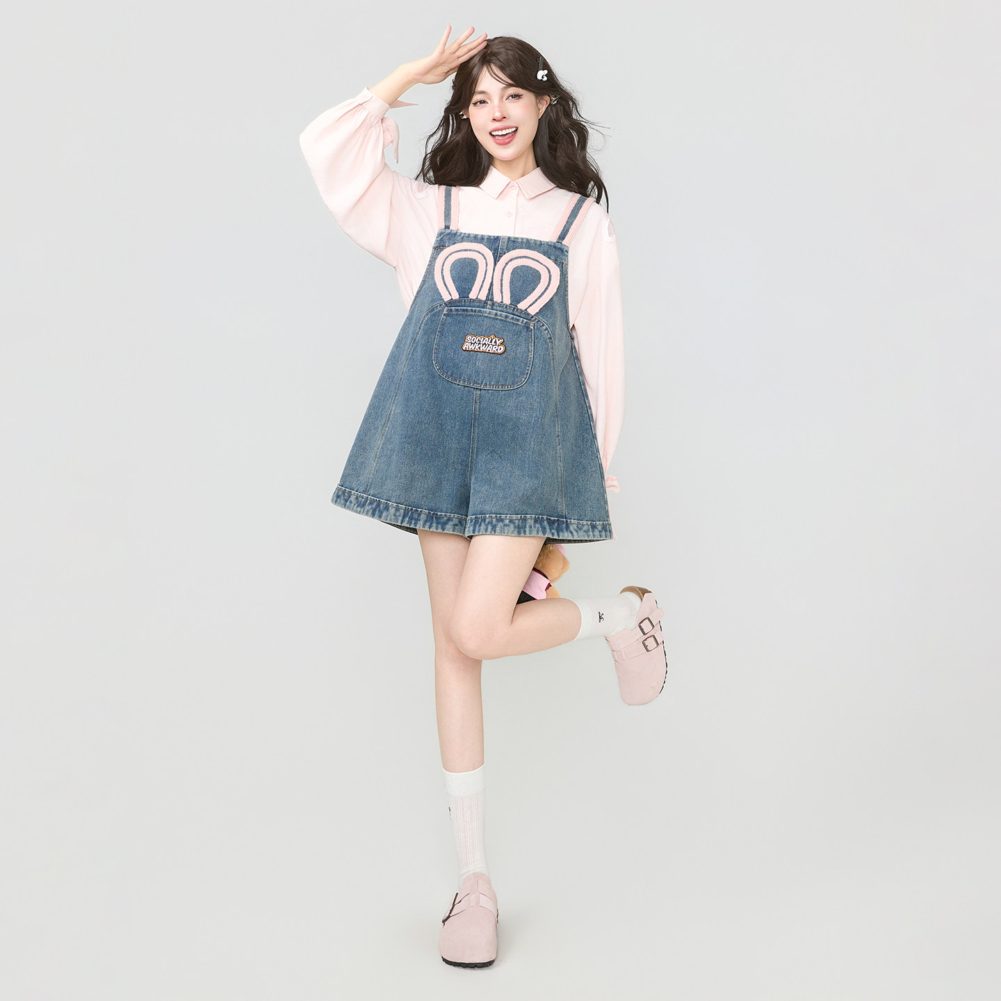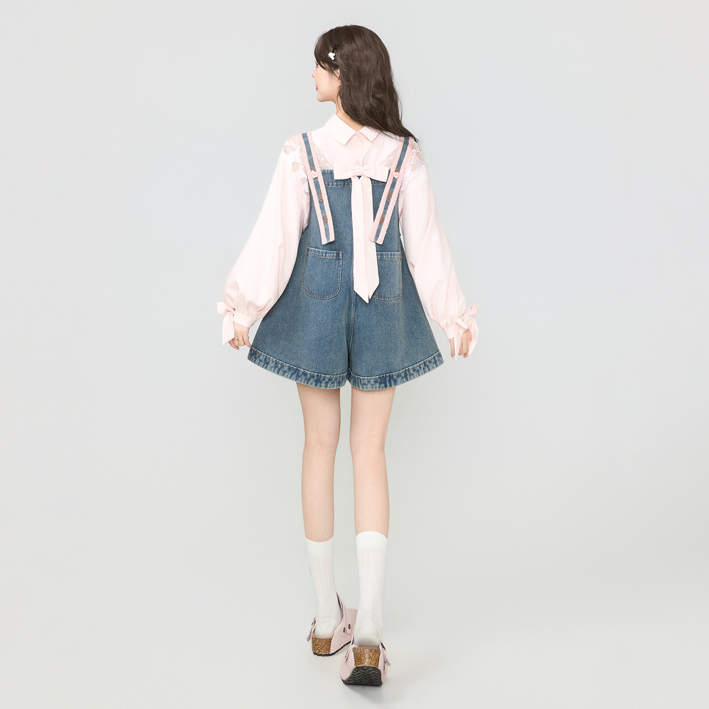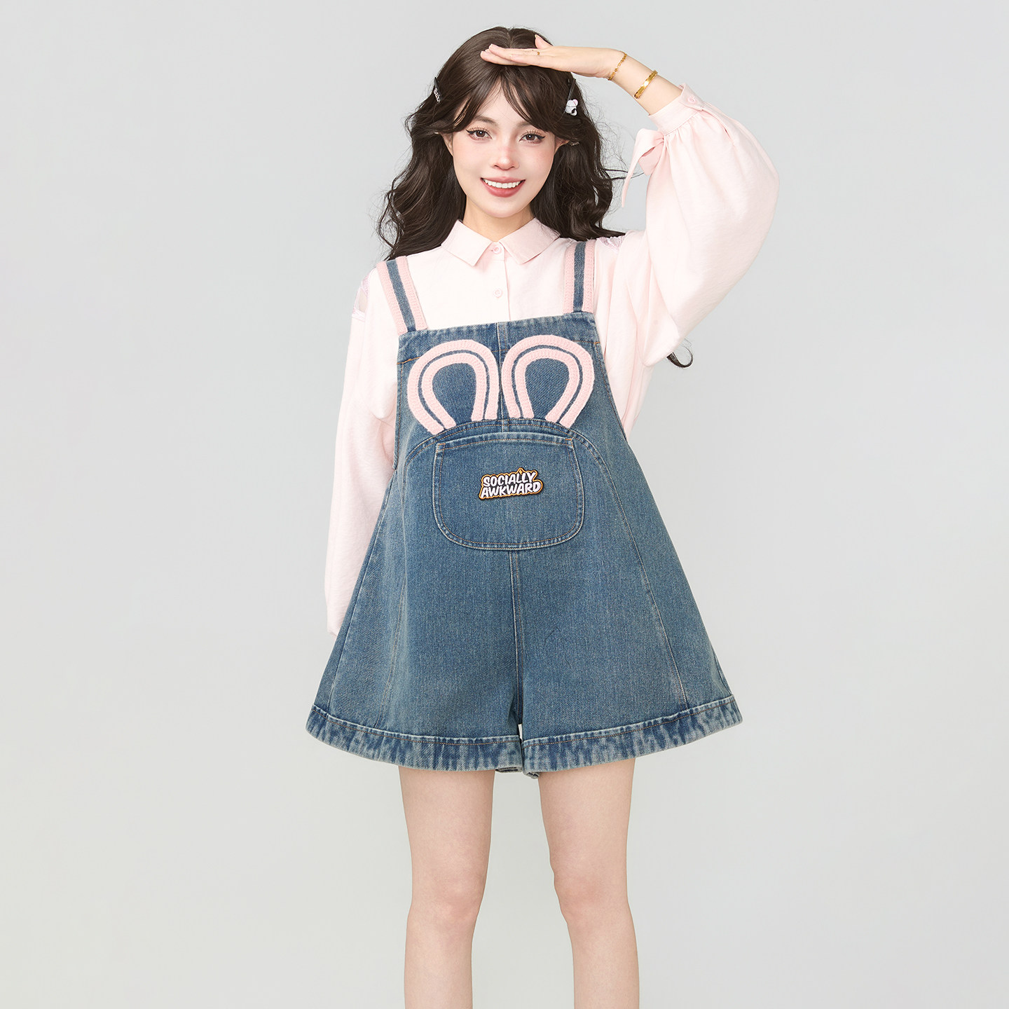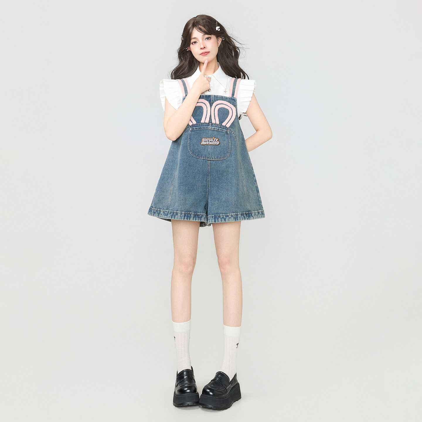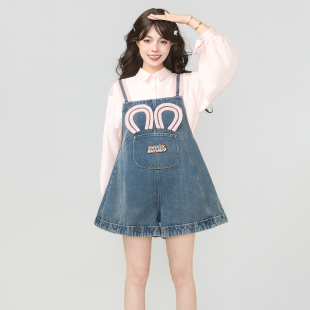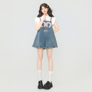 甜美撞色肩带连身阔腿短裤 KEIKO 2026夏季 气少女穿搭背带牛仔裤 元