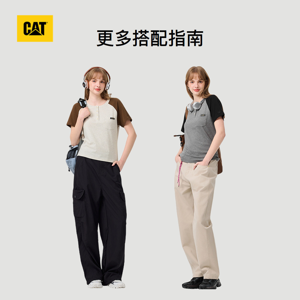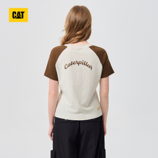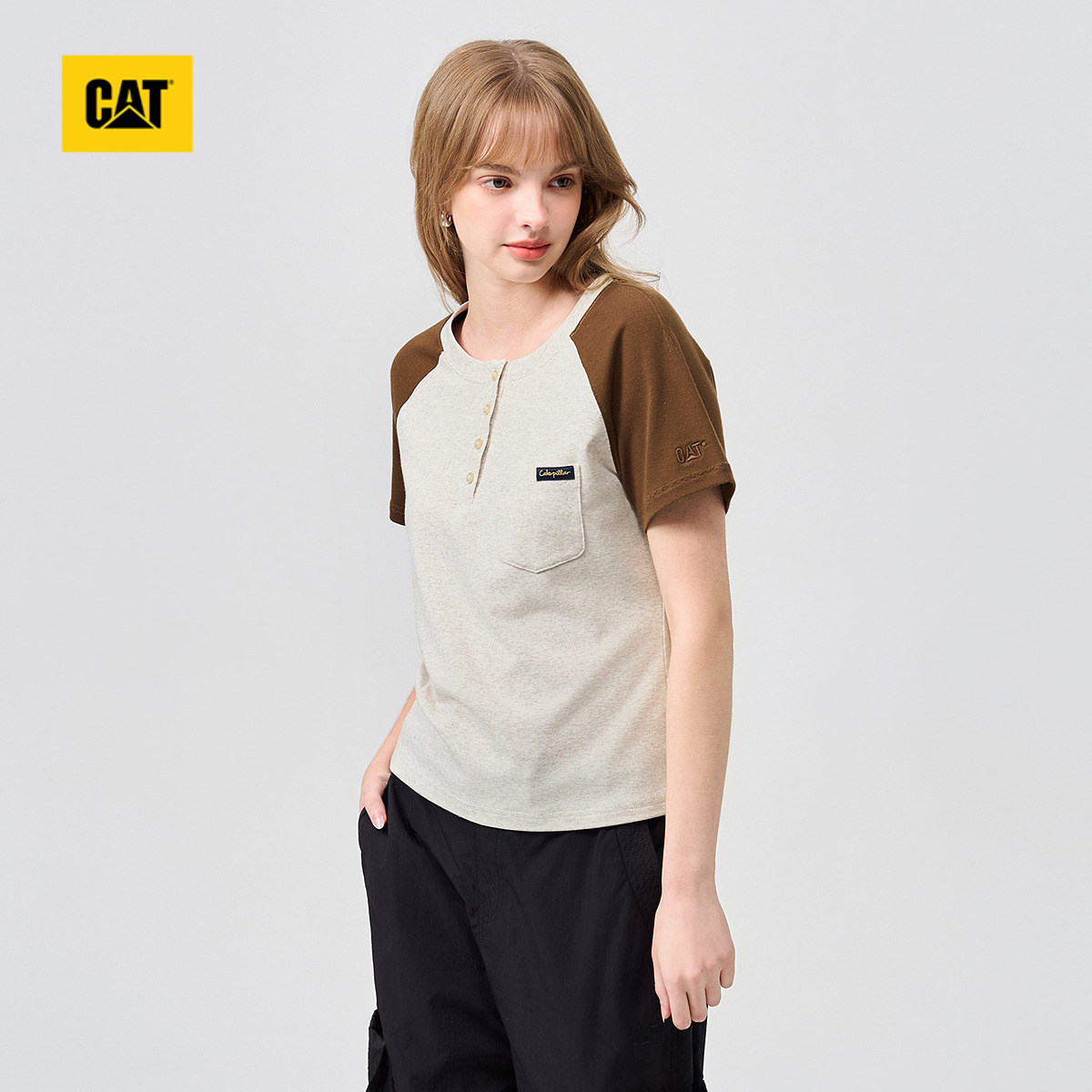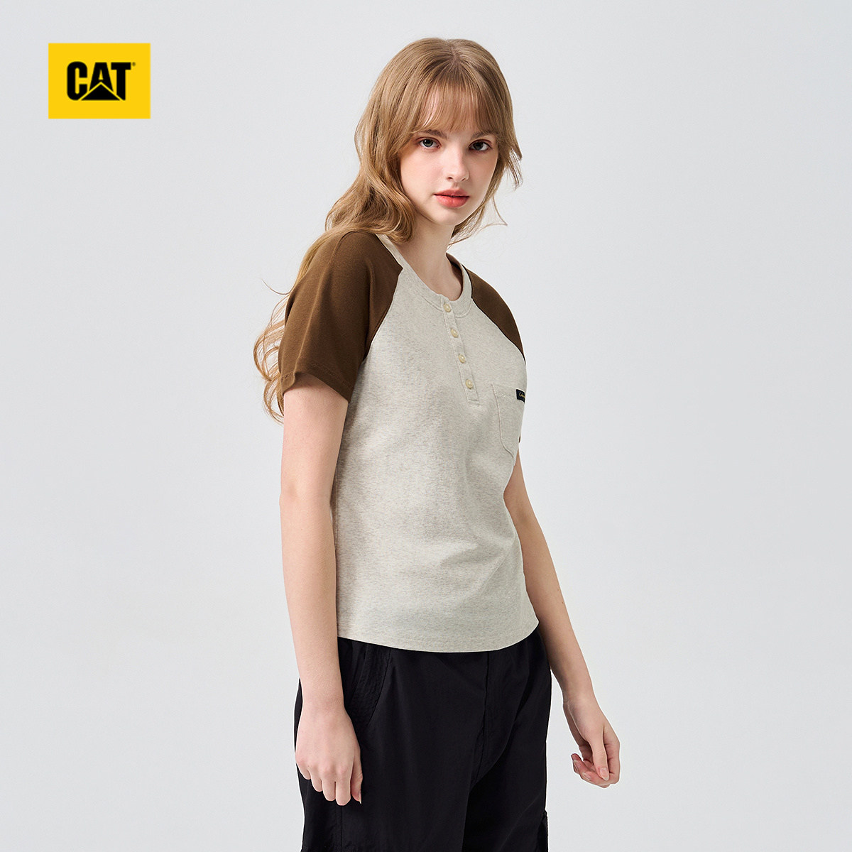 商场同款 CAT卡特26春季 拼色半开襟亨利领T恤短袖 女士复古修身 新品
